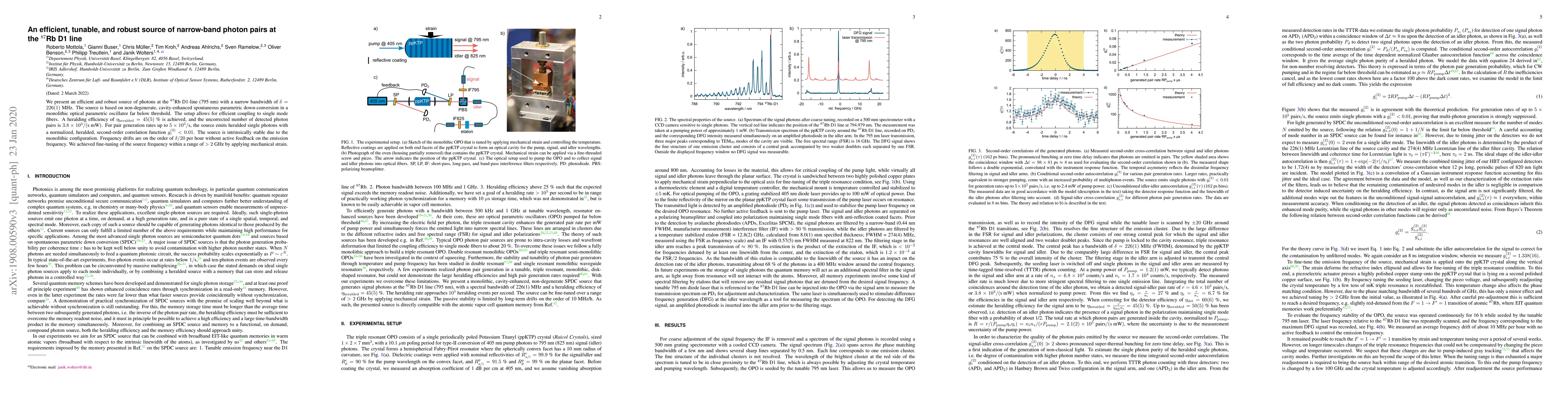 This research presents a highly efficient and stable source of narrow-band photon pairs at the $^{87}$Rb D1 line, utilizing cavity-enhanced spontaneous parametric down-conversion with a bandwidth of 226 MHz. The setup achieves a heralding efficiency of 45% and is tunable over more than 2 GHz through mechanical strain, ensuring intrinsic stability and low frequency drift.