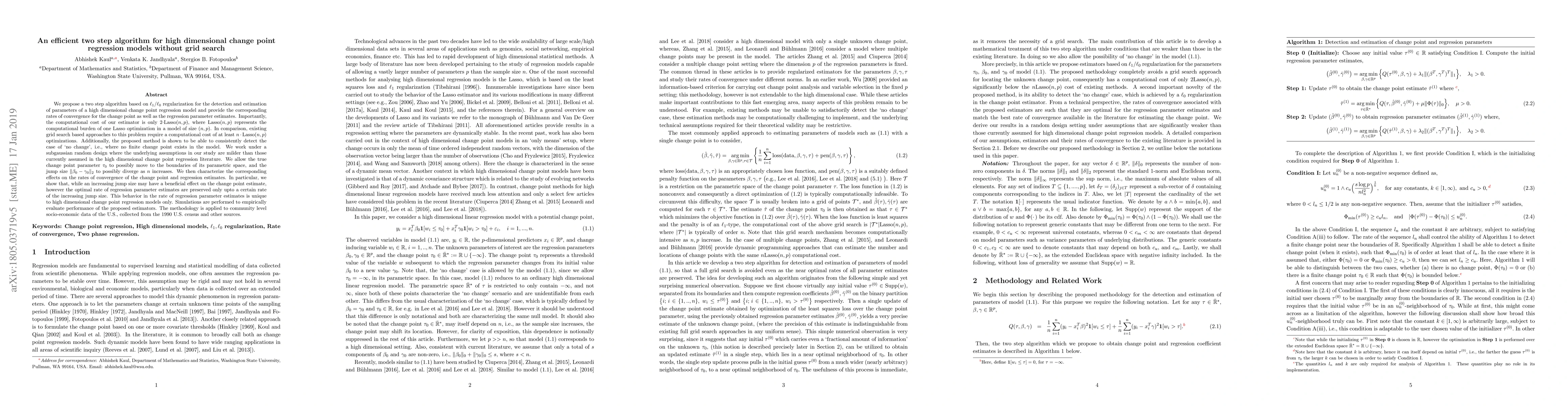 This paper proposes a computationally efficient two-step algorithm for high-dimensional change point regression models, utilizing $\ell_1/\ell_0$ regularization, which avoids grid search and significantly reduces computational cost compared to existing methods. The algorithm is shown to consistently detect the absence of change points and maintains optimal convergence rates under milder assumptions.