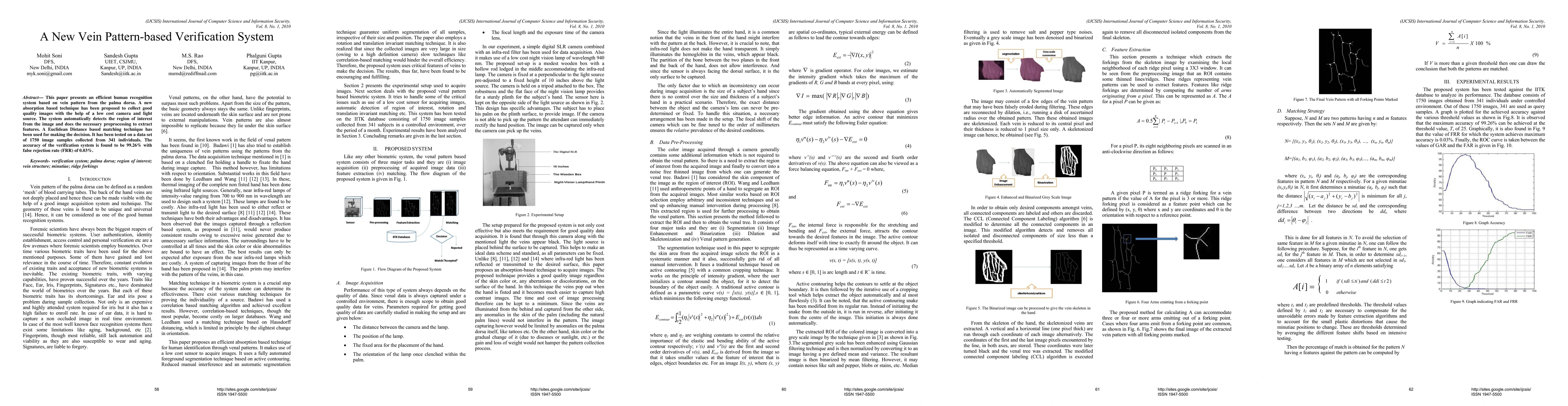 This paper presents an efficient human recognition system based on vein pattern from the palma dorsa. A new absorption based technique has been proposed to collect good quality images with the help of a low cost camera and light source. The system automatically detects the region of interest from the image and does the necessary preprocessing to extract features. A Euclidean Distance based matching technique has been used for making the decision. It has been tested on a data set of 1750 image samples collected from 341 individuals. The accuracy of the verification system is found to be 99.26% with false rejection rate (FRR) of 0.03%.