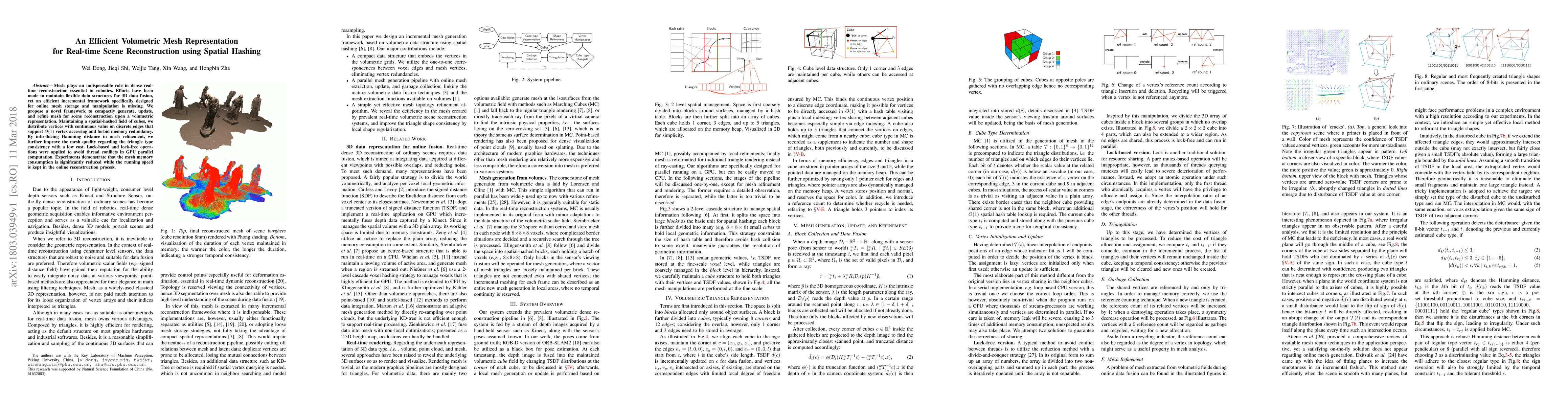 This paper proposes an efficient volumetric mesh representation framework for real-time scene reconstruction using spatial hashing, which compactly generates, updates, and refines mesh with minimal memory redundancy and high-speed access. The method employs spatial-hashed cubes and Hamming distance for mesh refinement, ensuring thread-safe parallel computation on GPU.