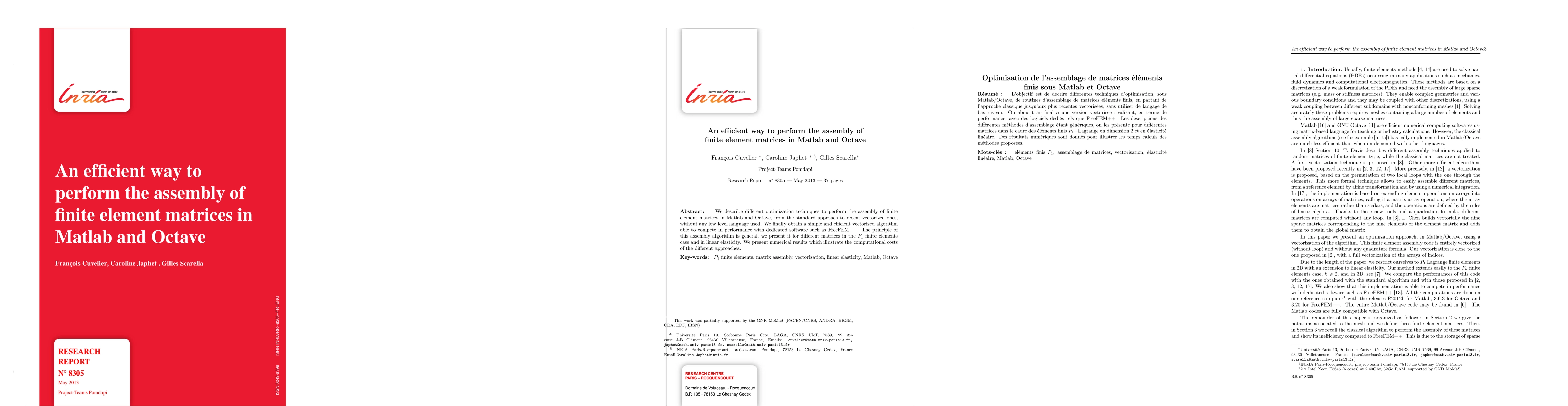 This paper presents optimization techniques for efficiently assembling finite element matrices in Matlab and Octave, comparing standard methods with vectorized approaches. The proposed vectorized algorithm achieves performance comparable to specialized software like FreeFEM++, demonstrating its general applicability in P1 finite elements and linear elasticity contexts.