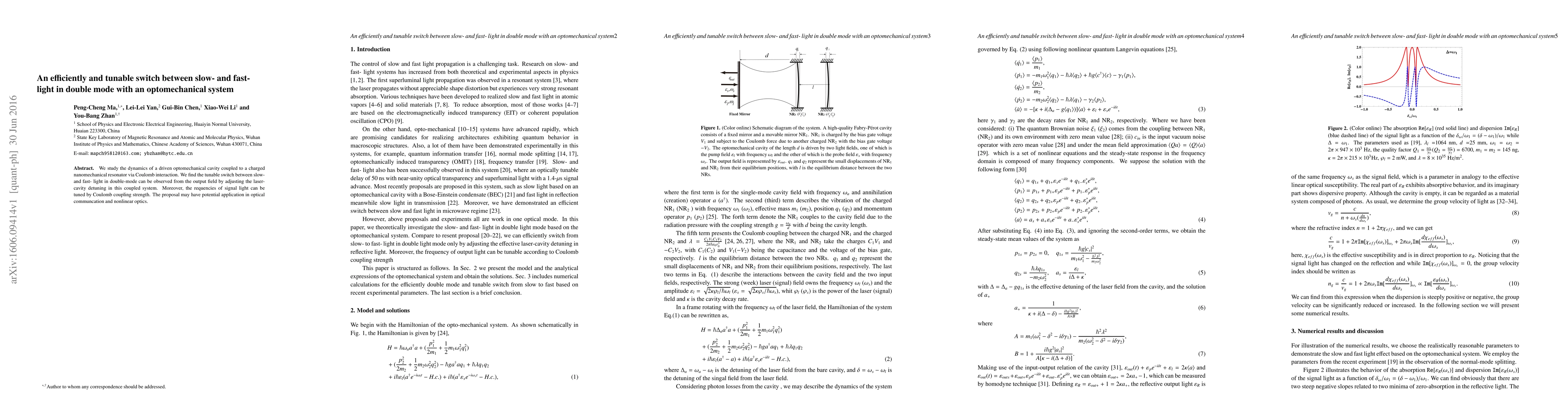 This research proposes a tunable switch between slow- and fast-light in a double-mode optomechanical system by adjusting laser-cavity detuning, with potential applications in optical communication and nonlinear optics. The dynamics involve a driven optomechanical cavity coupled to a nanomechanical resonator via Coulomb interaction.