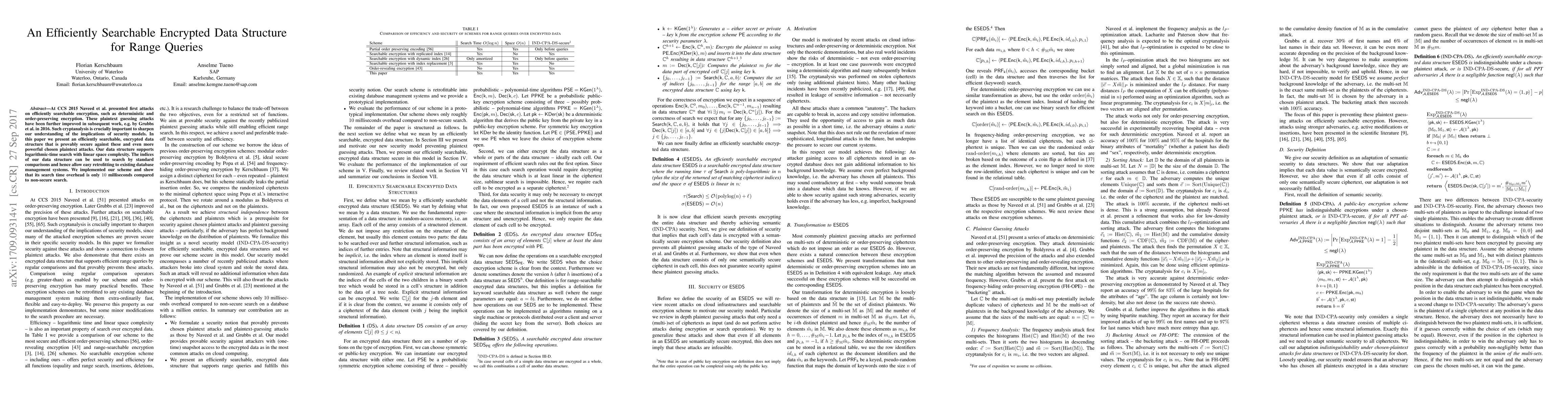 This paper introduces a provably secure, efficiently searchable encrypted data structure that withstands advanced chosen plaintext attacks, supporting logarithmic-time range queries with linear space complexity. The proposed solution is easily retrofittable to existing database systems, with a search time overhead of only 10 milliseconds.