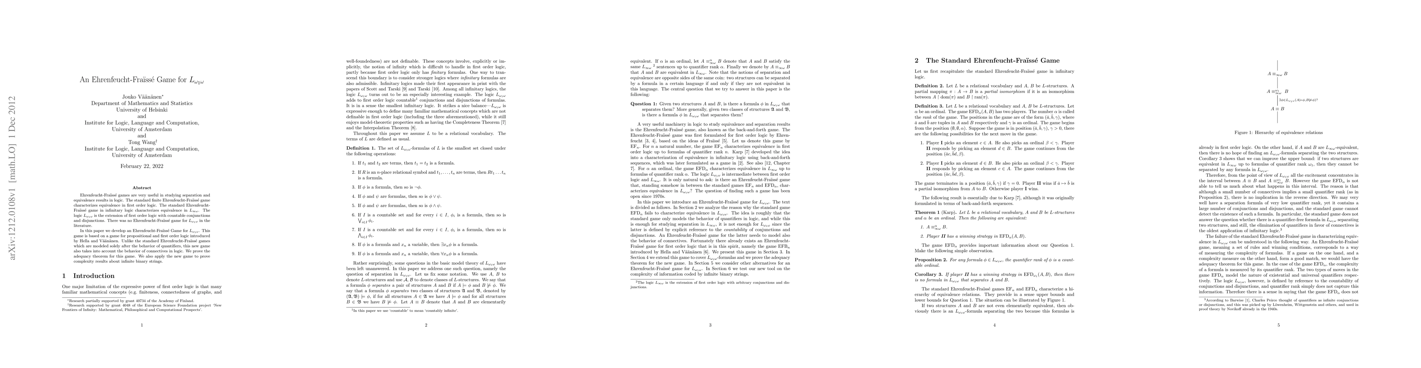This paper develops a new Ehrenfeucht-Fraisse game for the infinitary logic $L_{\omega_1\omega}$, extending beyond first-order logic to include countable conjunctions and disjunctions. Unlike standard games, this game considers both quantifiers and connectives, and the authors prove its adequacy and apply it to demonstrate complexity results for infinite binary strings.