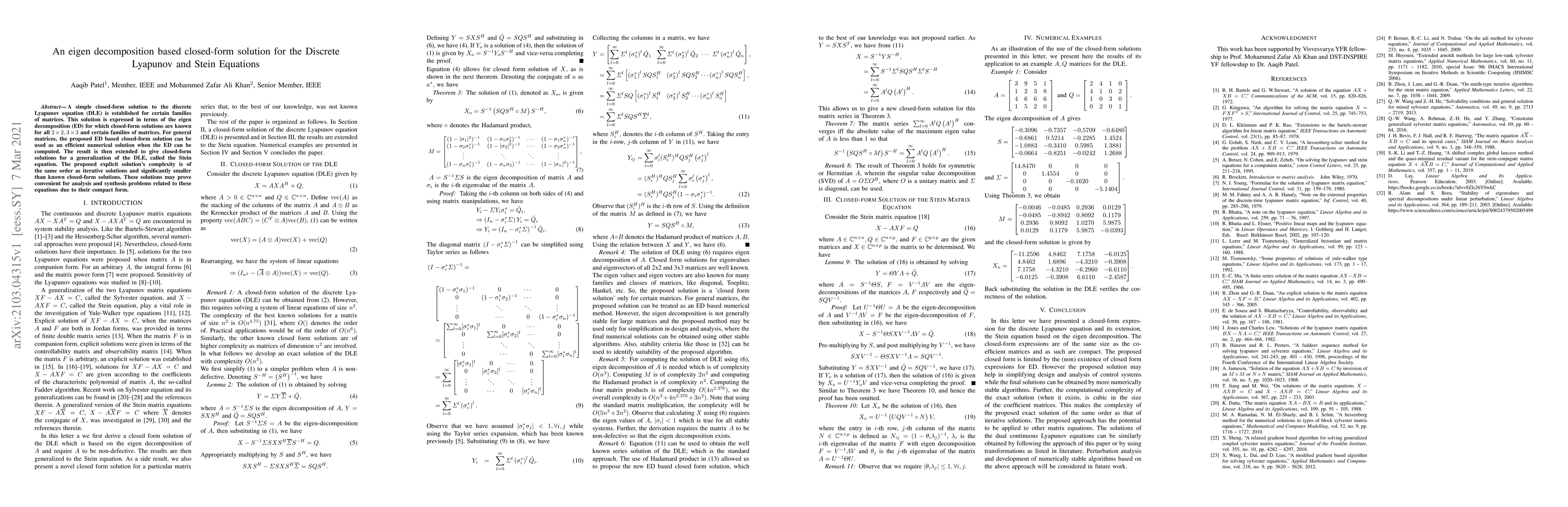 This paper presents a closed-form solution for the discrete Lyapunov equation using eigen decomposition, applicable for specific matrix families and efficient numerically for others. The method is extended to the Stein equation, offering a compact and computationally efficient solution.