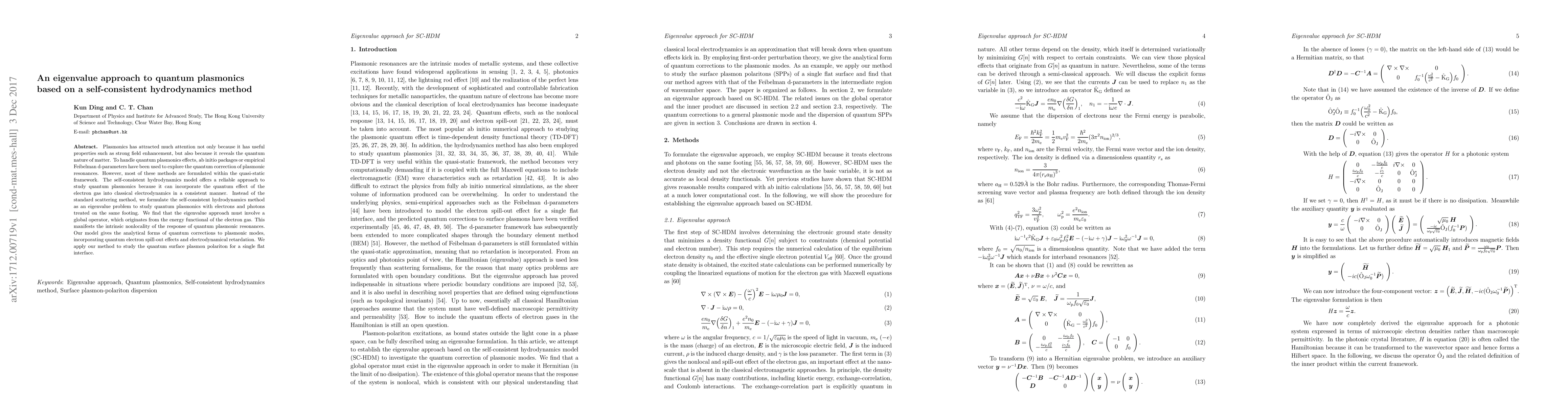 This paper proposes an eigenvalue approach based on self-consistent hydrodynamics to study quantum plasmonics, offering a method to incorporate quantum effects into classical electrodynamics. The model provides analytical forms for quantum corrections to plasmonic modes, revealing the intrinsic nonlocality of quantum plasmonic resonances.