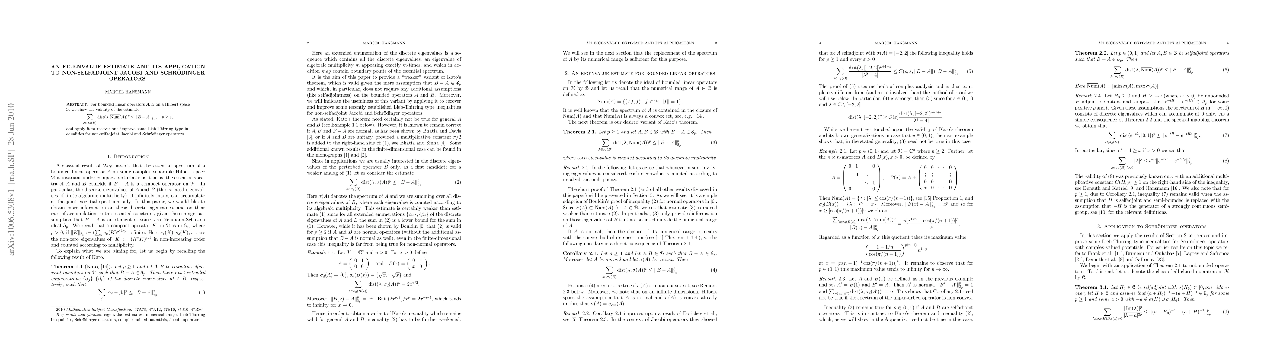 This paper establishes an eigenvalue estimate for bounded linear operators on a Hilbert space and applies it to enhance Lieb-Thirring type inequalities for non-selfadjoint Jacobi and Schrödinger operators. The key result is an inequality involving the distance between eigenvalues of operators and their operator norm difference.