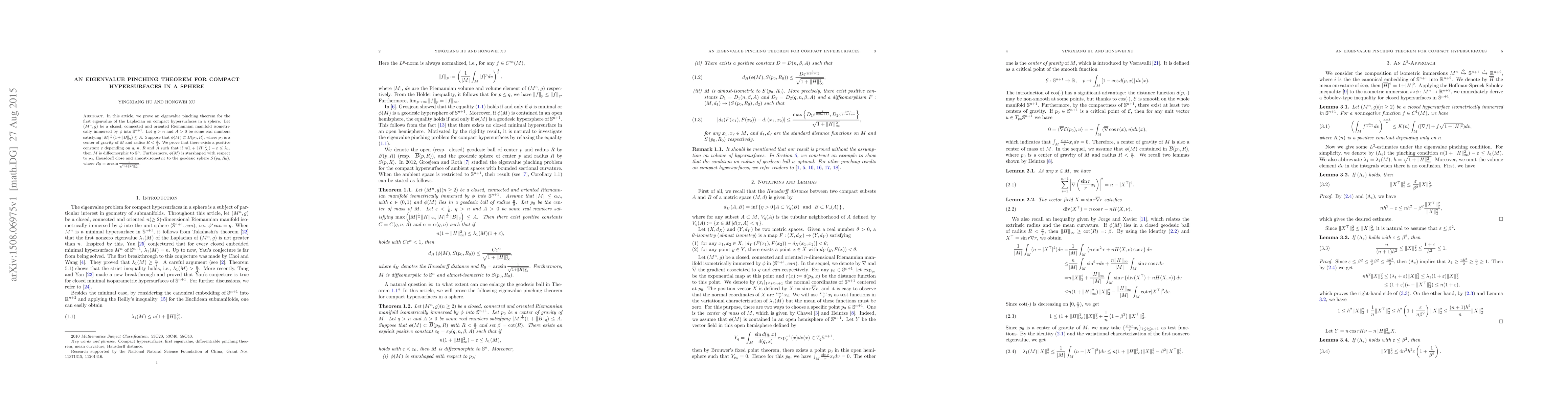 This paper proves an eigenvalue pinching theorem for the first eigenvalue of the Laplacian on compact hypersurfaces in a sphere, showing that if the hypersurface satisfies certain geometric constraints, it must be diffeomorphic to a sphere. The result also establishes that the hypersurface is starshaped and close to a geodesic sphere.