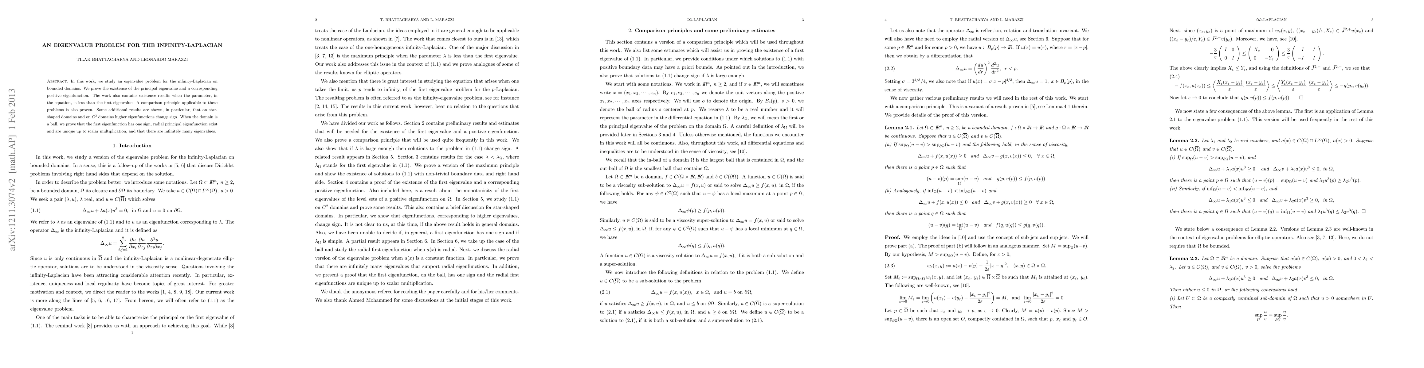 This paper investigates the eigenvalue problem for the infinity-Laplacian, proving the existence of the principal eigenvalue and a corresponding positive eigenfunction. It also establishes existence results for lower parameter values and proves a comparison principle applicable to these problems.