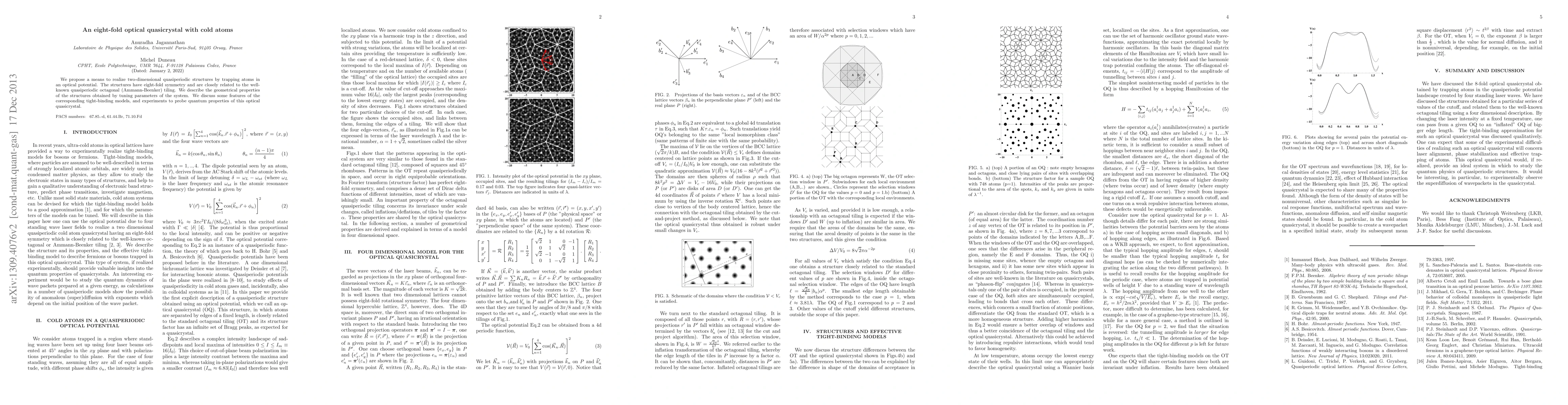 This paper proposes a method to create two-dimensional, eight-fold symmetric optical quasicrystals using cold atoms trapped in an optical potential, closely resembling Ammann-Beenker tiling, and explores their geometrical and quantum properties through tight-binding models and planned experiments.