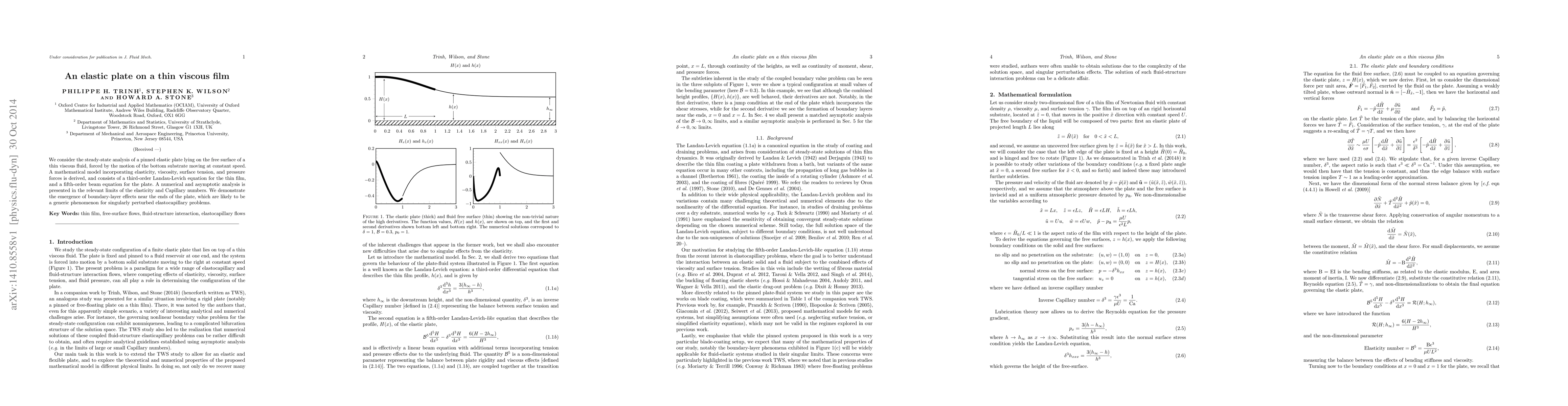 This research investigates the steady-state behavior of an elastic plate on a thin viscous film, deriving a mathematical model that combines elasticity and fluid dynamics. Numerical and asymptotic analyses reveal boundary-layer effects at the plate's ends, indicating these phenomena are common in elastocapillary interactions.