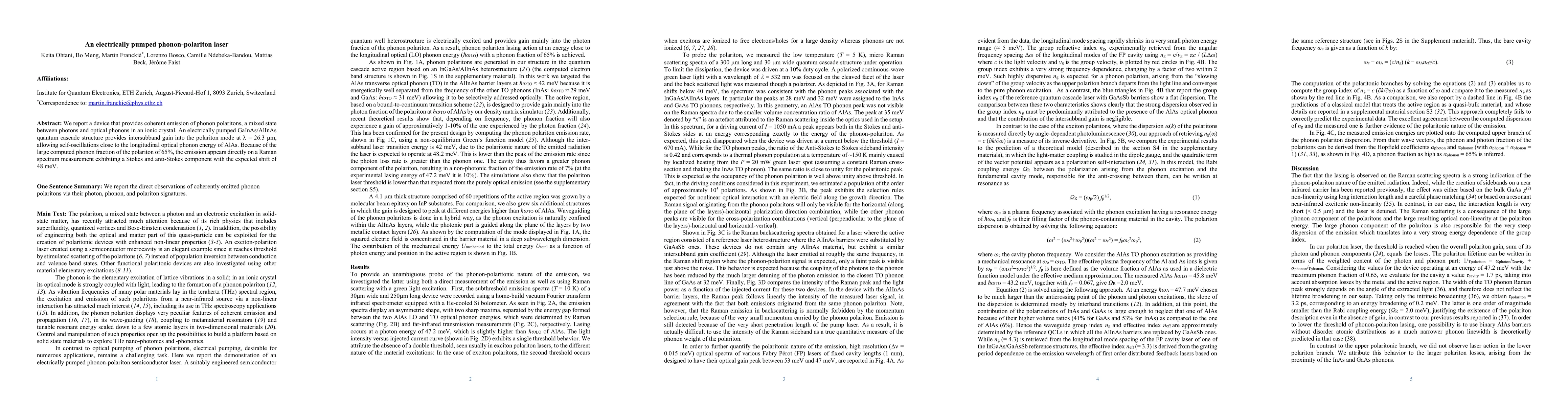 This research presents an electrically pumped device that generates coherent phonon-polariton emission, combining photons and optical phonons in an ionic crystal. The GaInAs/AlInAs quantum cascade structure enables intersubband gain, resulting in self-oscillations near the longitudinal optical phonon energy of AlAs, with a significant phonon fraction of 65% observable in Raman spectra.