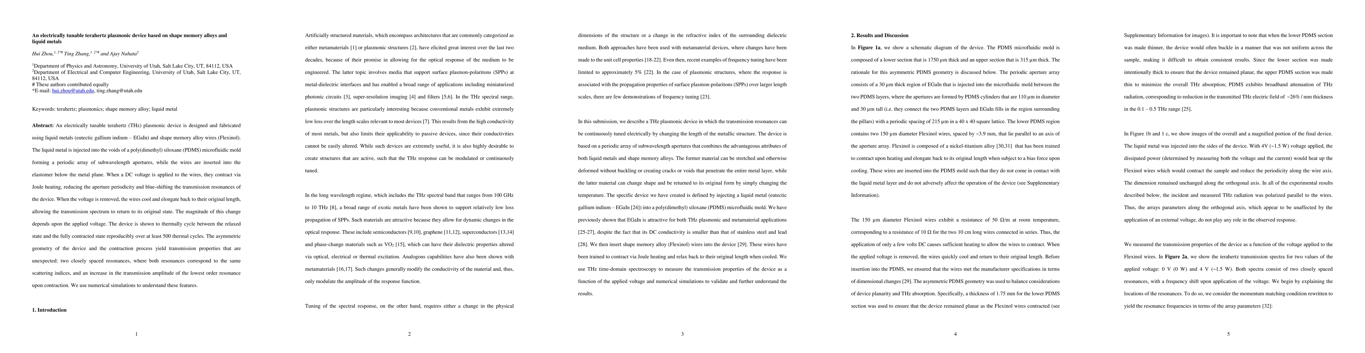 This paper presents an electrically tunable terahertz plasmonic device utilizing liquid metals and shape memory alloy wires. The device's transmission resonances shift with applied voltage due to the contraction of the wires, demonstrating reproducible thermal cycling over 500 cycles.