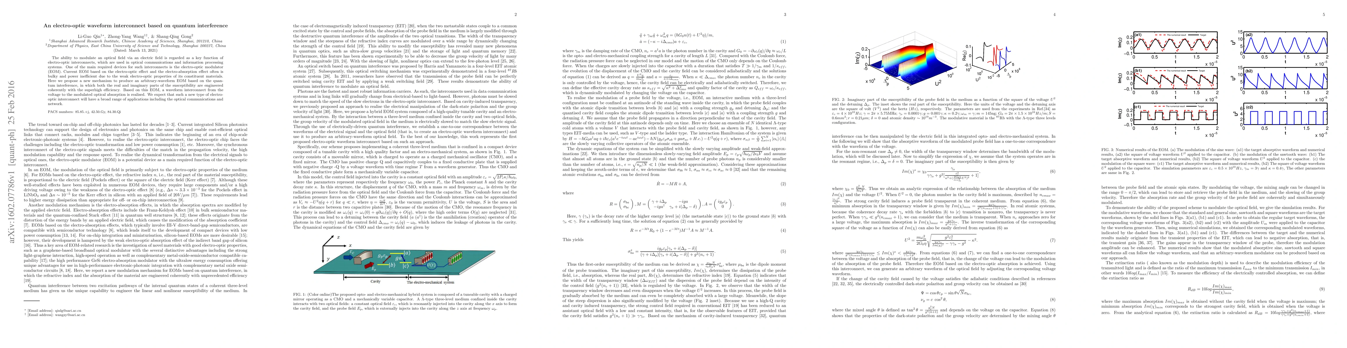 The ability to modulate an optical field via an electric field is regarded as a key function of electro-optic interconnects, which are used in optical communications and information processing systems. One of the main required devices for such interconnects is the electro-optic modulator (EOM). Current EOM based on the electro-optic effect and the electro-absorption effect often is bulky and power inefficient due to the weak electro-optic properties of its constituent materials. Here we propose a new mechanism to produce an arbitrary-waveform EOM based on the quantum interference, in which both the real and imaginary parts of the susceptibility are engineered coherently with the superhigh efficiency. Based on this EOM, a waveform interconnect from the voltage to the modulated optical absorption is realised. We expect that such a new type of electro-optic interconnect will have a broad range of applications including the optical communications and network.
