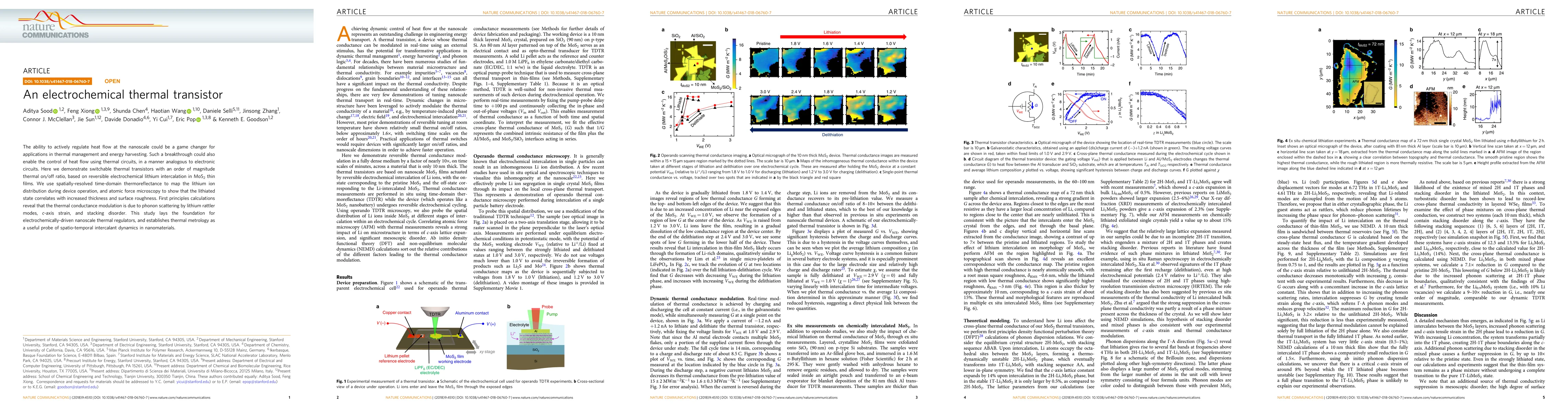 The ability to actively regulate heat flow at the nanoscale could be a game changer for applications in thermal management and energy harvesting. Such a breakthrough could also enable the control of heat flow using thermal circuits, in a manner analogous to electronic circuits. Here we demonstrate switchable thermal transistors with an order of magnitude thermal on/off ratio, based on reversible electrochemical lithium intercalation in MoS2 thin films. We use spatially-resolved time-domain thermoreflectance to map the lithium ion distribution during device operation, and atomic force microscopy to show that the lithiated state correlates with increased thickness and surface roughness. First principles calculations reveal that the thermal conductance modulation is due to phonon scattering by lithium rattler modes, c-axis strain, and stacking disorder. This study lays the foundation for electrochemically-driven nanoscale thermal regulators, and establishes thermal metrology as a useful probe of spatio-temporal intercalant dynamics in nanomaterials.