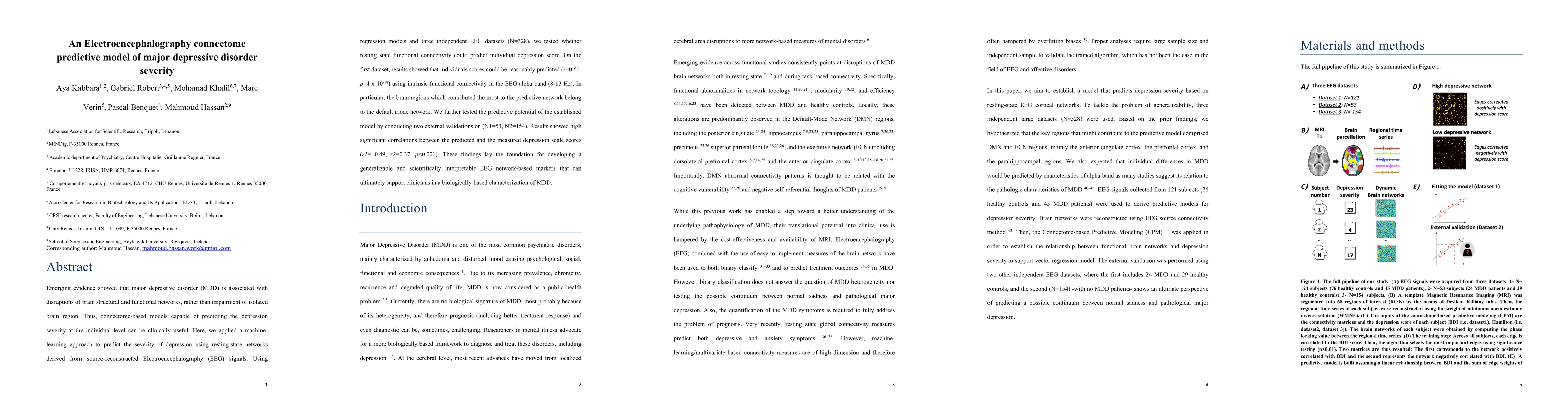 This study developed a machine-learning model to predict the severity of major depressive disorder (MDD) using resting-state EEG functional connectivity, finding significant correlations in three datasets (r=0.61, p=4 x 10-18). The model's predictive power was validated externally, suggesting potential for biologically-based MDD characterization.