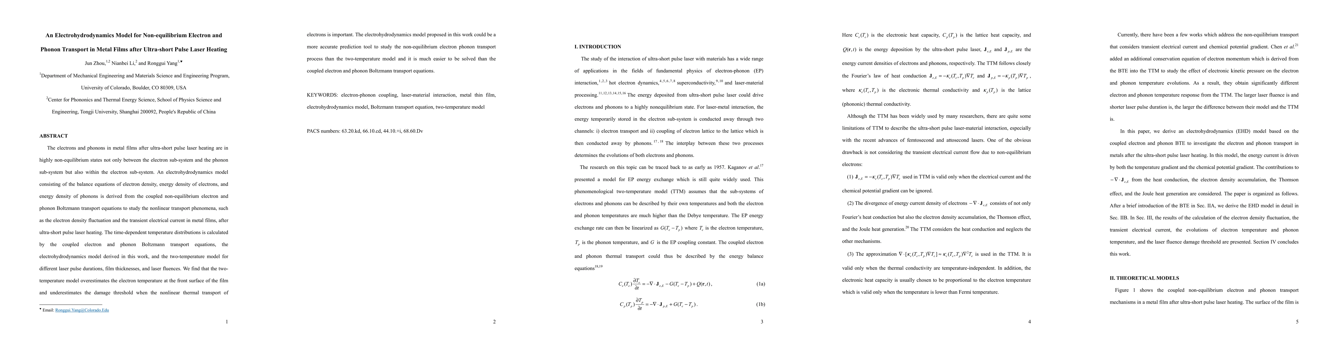 This paper develops an electrohydrodynamics model to study non-equilibrium electron and phonon transport in metal films following ultra-short pulse laser heating, finding that it provides a more accurate prediction than the two-temperature model, especially for nonlinear thermal transport scenarios.