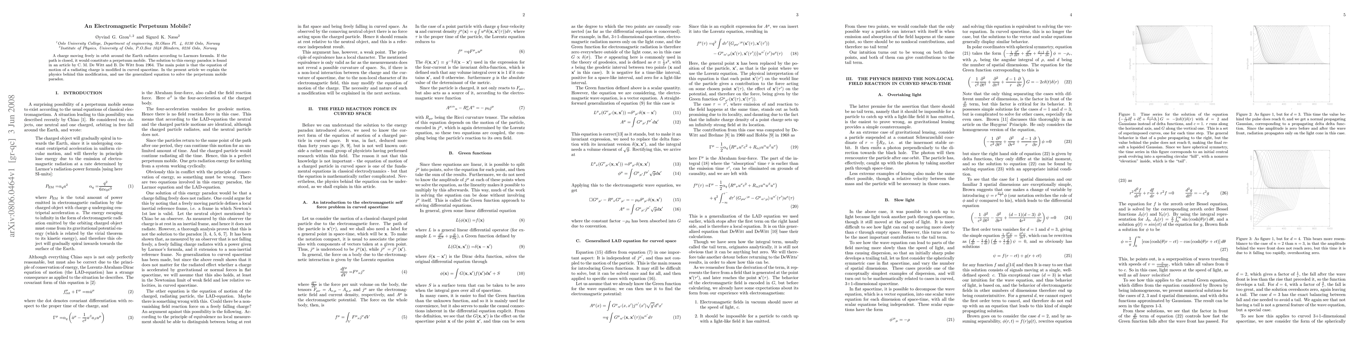 This paper explores the paradox of a charge orbiting the Earth that would radiate energy and potentially create a perpetuum mobile. It resolves this paradox by explaining how the equation of motion for a radiating charge is modified in curved spacetime, as originally proposed by DeWitt and DeWitt in 1964.