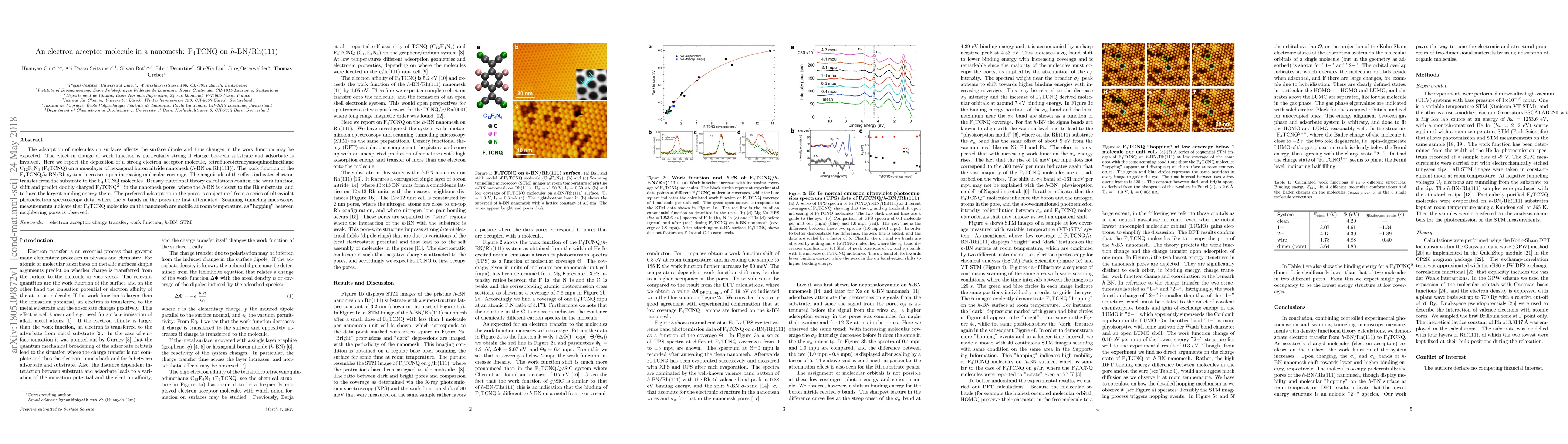 The adsorption of molecules on surfaces affects the surface dipole and thus changes in the work function may be expected. The effect in change of work function is particularly strong if charge between substrate and adsorbate is involved. Here we report the deposition of a strong electron acceptor molecule, tetrafluorotetracyanoquinodimethane C$_{12}$F$_4$N$_4$ (F$_{4}$TCNQ) on a monolayer of hexagonal boron nitride nanomesh ($h$-BN on Rh(111)). The work function of the F$_{4}$TCNQ/$h$-BN/Rh system increases upon increasing molecular coverage. The magnitude of the effect indicates electron transfer from the substrate to the F$_{4}$TCNQ molecules. Density functional theory calculations confirm the work function shift and predict doubly charged F$_{4}$TCNQ$^{2-}$ in the nanomesh pores, where the $h$-BN is closest to the Rh substrate, and to have the largest binding energy there. The preferred adsorption in the pores is conjectured from a series of ultraviolet photoelectron spectroscopy data, where the $\sigma$ bands in the pores are first attenuated. Scanning tunneling microscopy measurements indicate that F$_{4}$TCNQ molecules on the nanomesh are mobile at room temperature, as "hopping" between neighboring pores is observed.