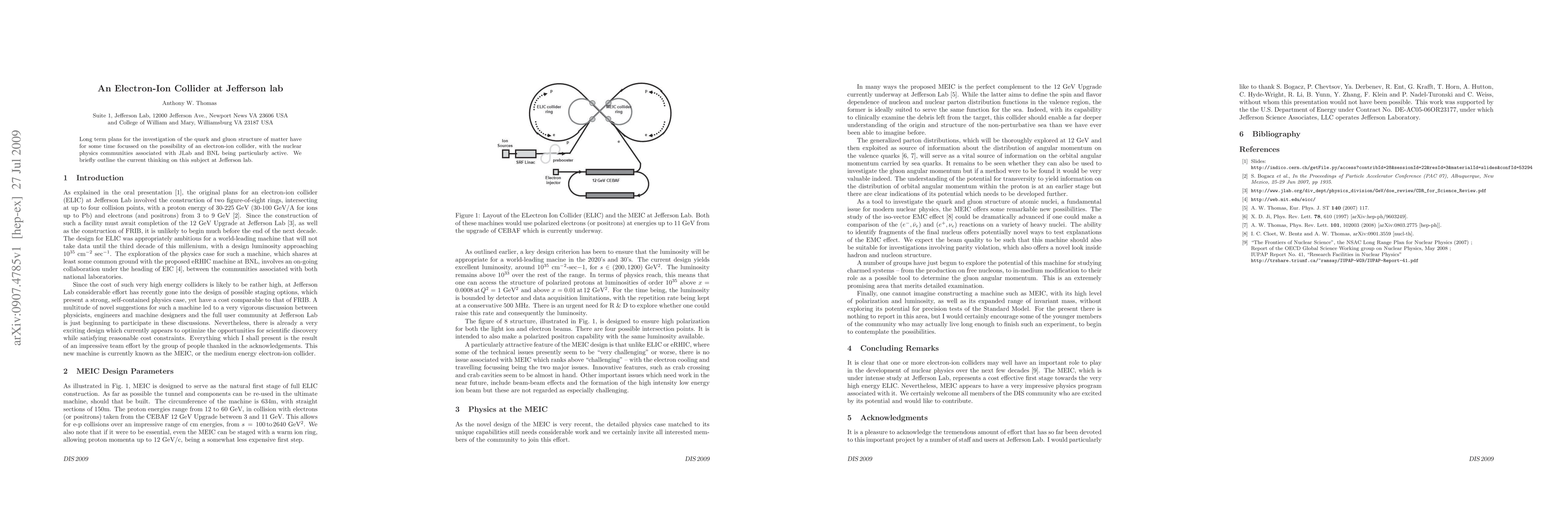 Summary: This paper discusses the long-term plans for constructing an Electron-Ion Collider at Jefferson Lab to investigate the quark and gluon structure of matter, highlighting the active involvement of the nuclear physics communities at JLab and BNL.