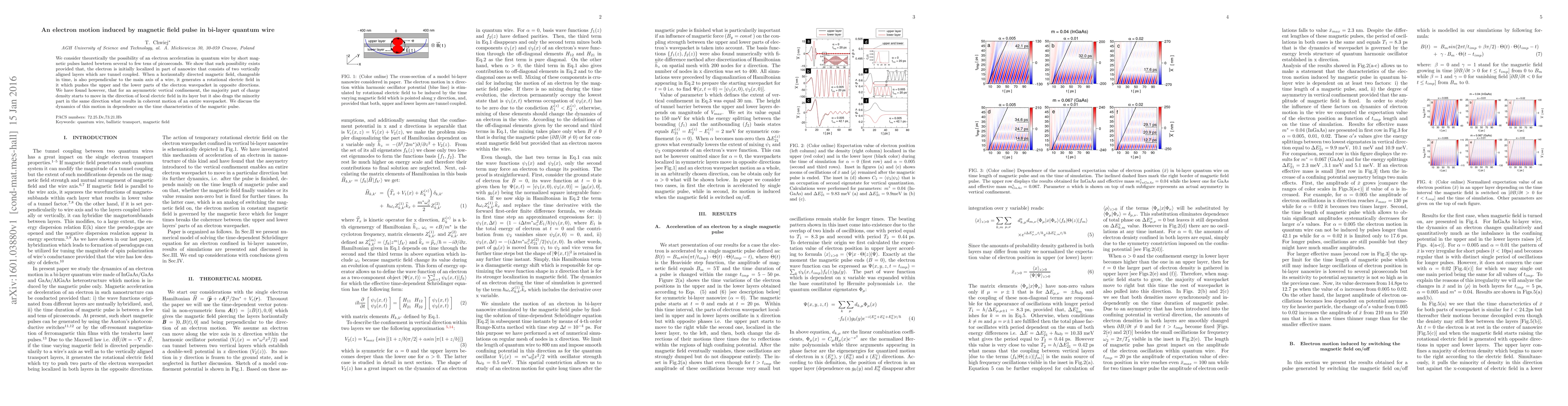This paper theoretically explores electron acceleration in a bi-layer quantum wire via short magnetic pulses. It demonstrates that a horizontally directed magnetic field perpendicular to the wire axis induces a rotational electric field, causing the electron wavepacket to move coherently in opposite directions, with asymmetric vertical confinement leading to coherent motion of the entire wavepacket.