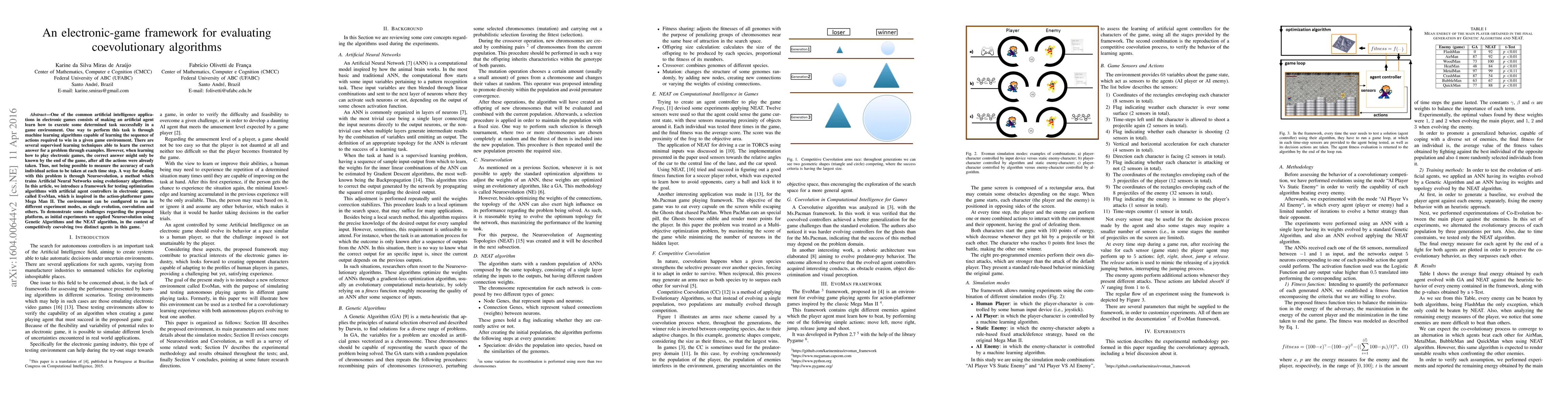 One of the common artificial intelligence applications in electronic games consists of making an artificial agent learn how to execute some determined task successfully in a game environment. One way to perform this task is through machine learning algorithms capable of learning the sequence of actions required to win in a given game environment. There are several supervised learning techniques able to learn the correct answer for a problem through examples. However, when learning how to play electronic games, the correct answer might only be known by the end of the game, after all the actions were already taken. Thus, not being possible to measure the accuracy of each individual action to be taken at each time step. A way for dealing with this problem is through Neuroevolution, a method which trains Artificial Neural Networks using evolutionary algorithms. In this article, we introduce a framework for testing optimization algorithms with artificial agent controllers in electronic games, called EvoMan, which is inspired in the action-platformer game Mega Man II. The environment can be configured to run in different experiment modes, as single evolution, coevolution and others. To demonstrate some challenges regarding the proposed platform, as initial experiments we applied Neuroevolution using Genetic Algorithms and the NEAT algorithm, in the context of competitively coevolving two distinct agents in this game.