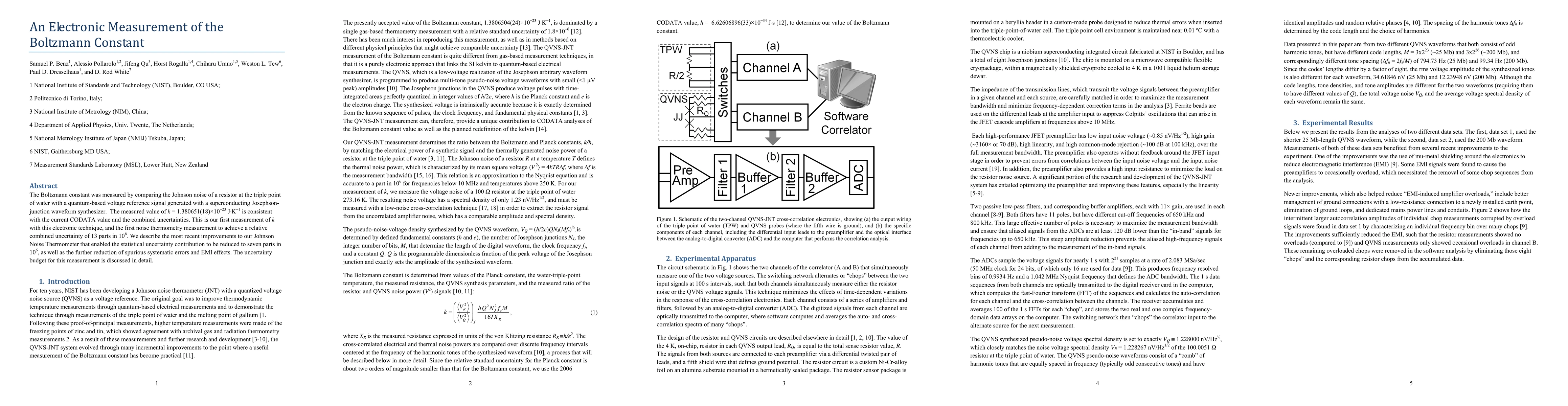 This paper reports a novel electronic measurement of the Boltzmann constant using Johnson noise thermometry and a quantum-based voltage reference, achieving a relative uncertainty of 13 parts in 10^6. The measurement technique significantly reduces statistical and systematic errors, aligning closely with the current CODATA value.