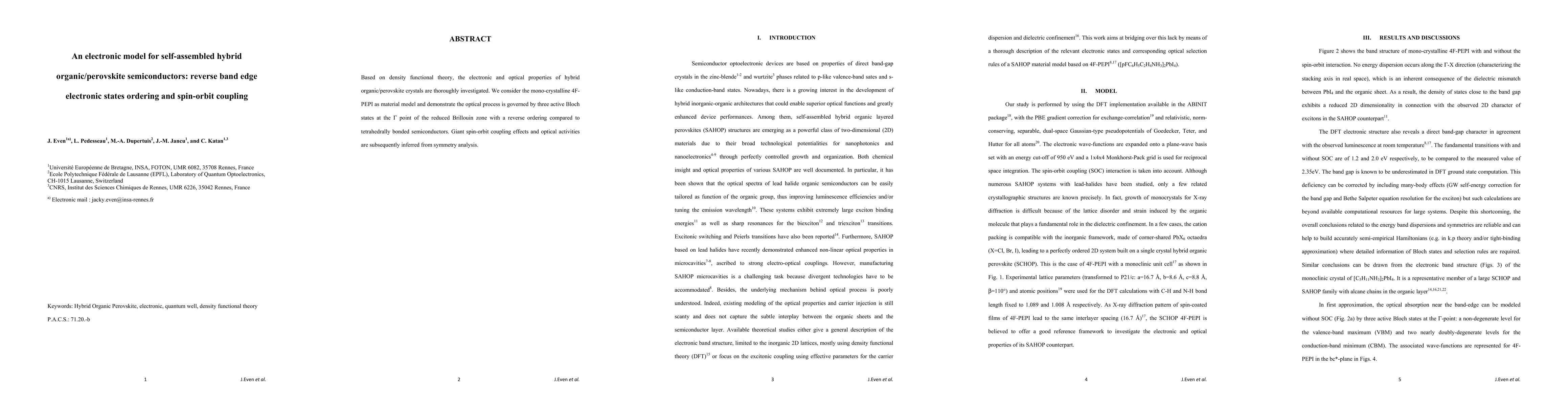 Based on density functional theory, the electronic and optical properties of hybrid organic/perovskite crystals are thoroughly investigated. We consider the mono-crystalline 4FPEPI as material model and demonstrate the optical process is governed by three active Bloch states at the {\Gamma} point of the reduced Brillouin zone with a reverse ordering compared to tetrahedrally bonded semiconductors. Giant spin-orbit coupling effects and optical activities are subsequently inferred from symmetry analysis.