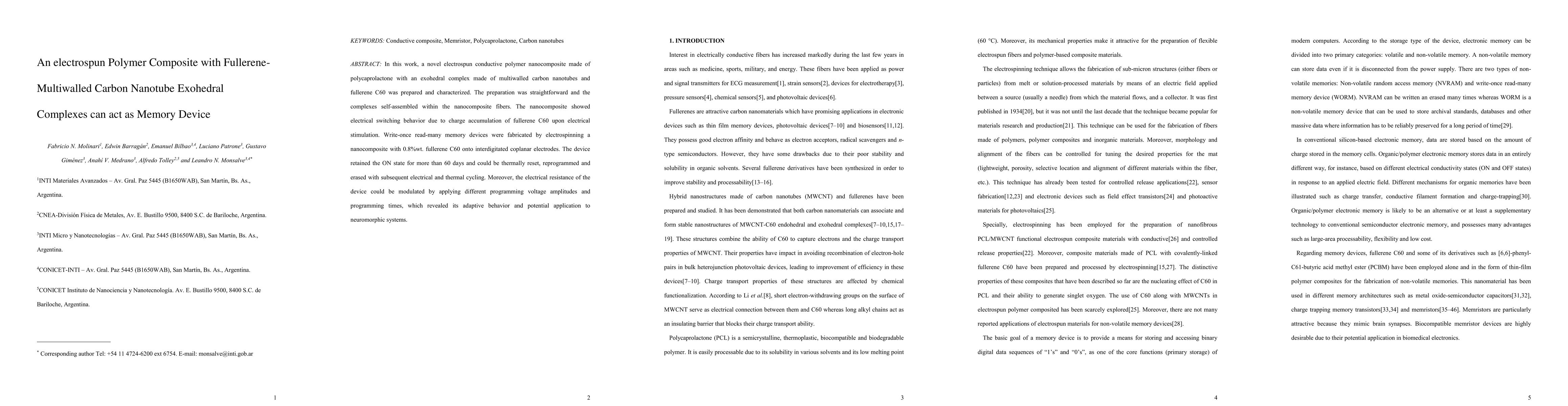 In this work, a novel electrospun conductive polymer nanocomposite made of polycaprolactone with an exohedral complex made of multiwalled carbon nanotubes and fullerene C60 was prepared and characterized. The preparation was straightforward and the complexes self-assembled within the nanocomposite fibers. The nanocomposite showed electrical switching behavior due to charge accumulation of fullerene C60 upon electrical stimulation. Write-once read-many memory devices were fabricated by electrospinning a nanocomposite with 0.8%wt. fullerene C60 onto interdigitated coplanar electrodes. The device retained the ON state for more than 60 days and could be thermally reset, reprogrammed and erased with subsequent electrical and thermal cycling. Moreover, the electrical resistance of the device could be modulated by applying different programming voltage amplitudes and programming times, which revealed its adaptive behavior and potential application to neuromorphic systems.