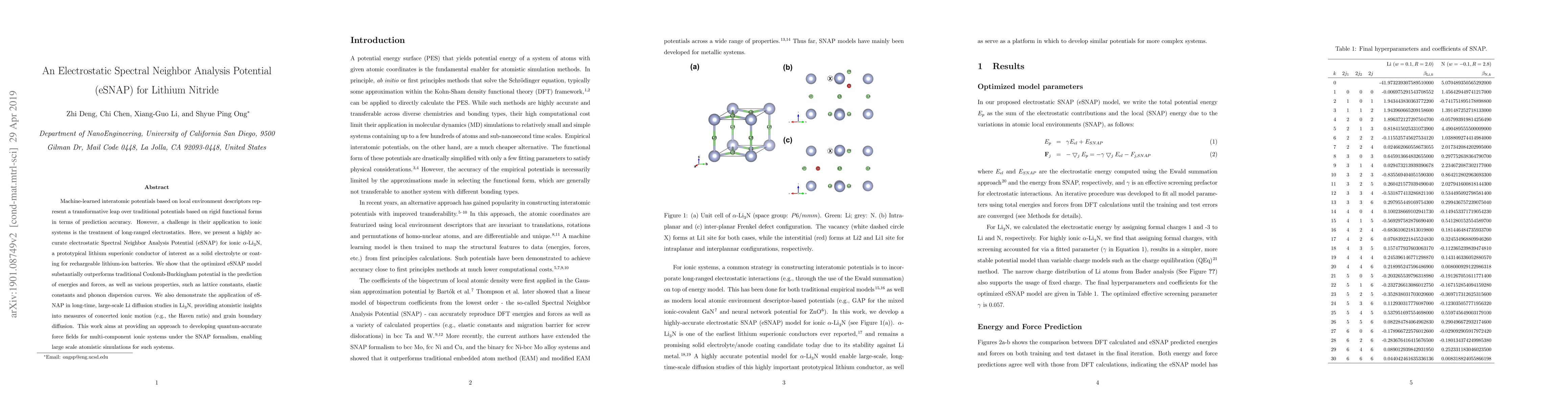 This paper introduces an Electrostatic Spectral Neighbor Analysis Potential (eSNAP) for lithium nitride, demonstrating its superior accuracy over traditional Coulomb-Buckingham potentials for predicting energies, forces, lattice constants, elastic constants, and phonon dispersion curves. The eSNAP model also provides insights into long-range ionic motion and grain boundary diffusion in large-scale simulations.