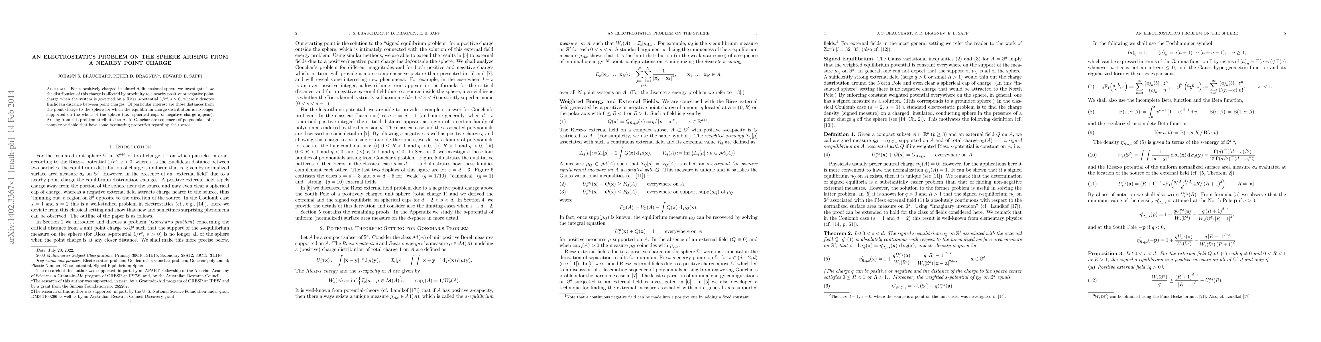 For a positively charged insulated d-dimensional sphere we investigate how the distribution of this charge is affected by proximity to a nearby positive or negative point charge when the system is governed by a Riesz s-potential 1/r^s, s>0, where r denotes Euclidean distance between point charges. Of particular interest are those distances from the point charge to the sphere for which the equilibrium charge distribution is no longer supported on the whole of the sphere (i.e. spherical caps of negative charge appear). Arising from this problem attributed to A. A. Gonchar are sequences of polynomials of a complex variable that have some fascinating properties regarding their zeros.