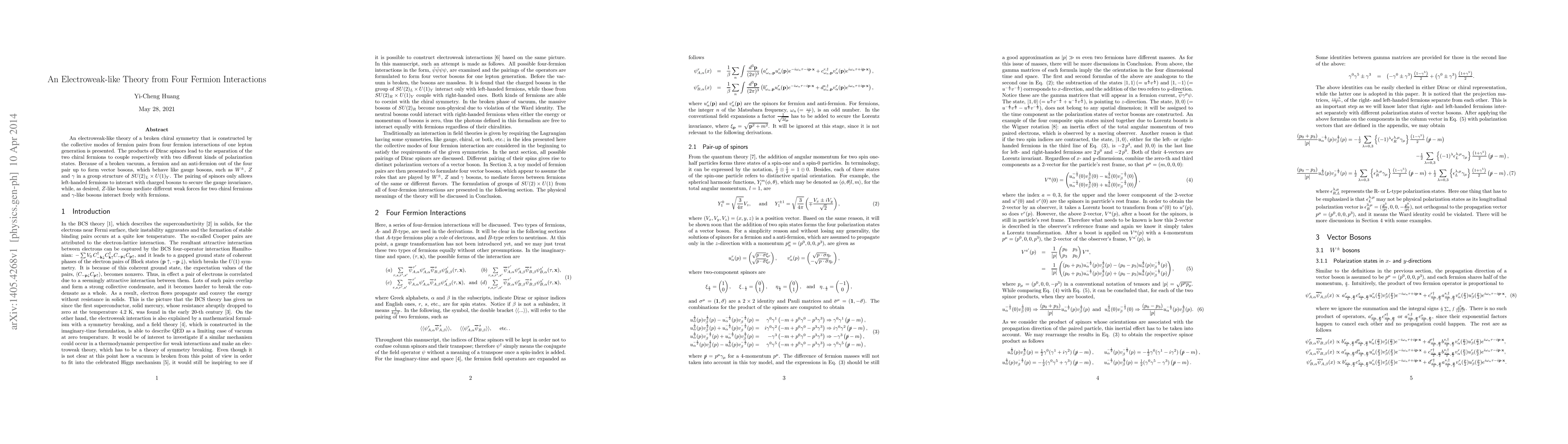 This paper proposes an electroweak-like theory based on four fermion interactions in one lepton generation, leading to a broken chiral symmetry. The theory results in vector bosons resembling $W^\pm$, $Z$, and $\gamma$ within an $SU(2)_L\times U(1)_Y$ structure, with left-handed fermions coupling only with charged bosons to maintain gauge invariance.