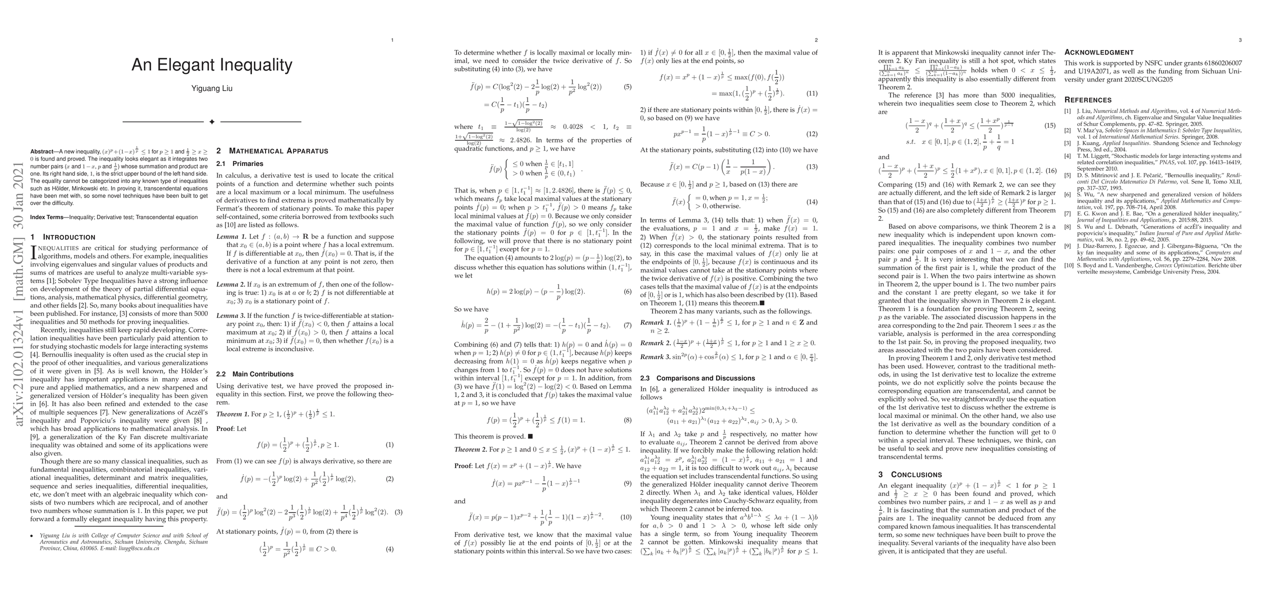 A new inequality, $(x)^{p}+(1-x)^{\frac{1}{p}}\leq1$ for $p \geq 1$ and $\frac{1}{2} \geq x \geq 0$ is found and proved. The inequality looks elegant as it integrates two number pairs ($x$ and $1-x$, $p$ and $\frac{1}{p}$) whose summation and product are one. Its right hand side, $1$, is the strict upper bound of the left hand side. The equality cannot be categorized into any known type of inequalities such as H\"{o}lder, Minkowski etc. In proving it, transcendental equations have been met with, so some novel techniques have been built to get over the difficulty.