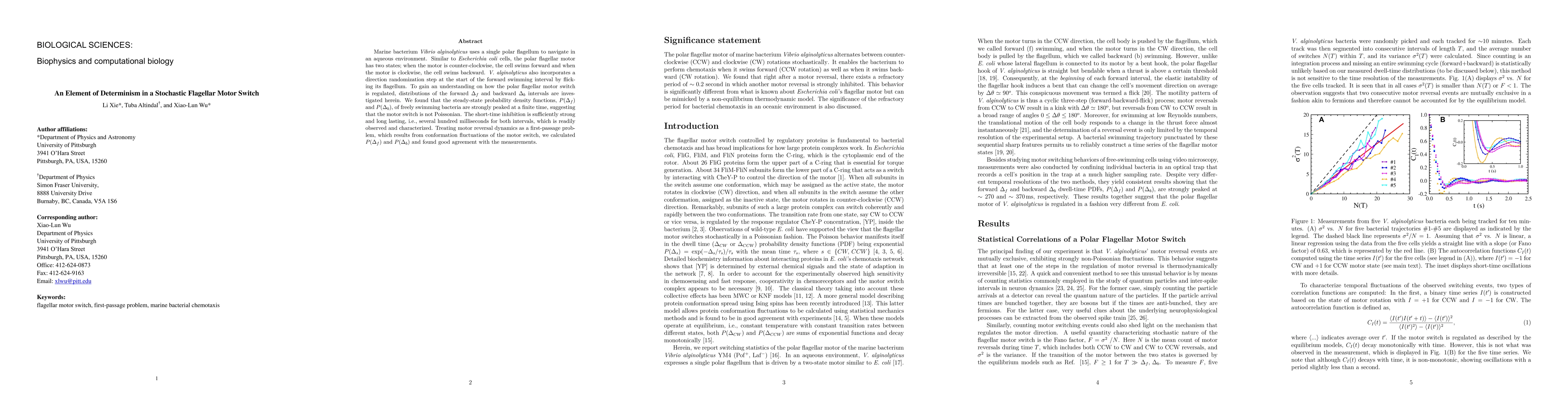 Marine bacterium Vibrio alginolyticus uses a single polar flagellum to navigate in an aqueous environment. Similar to Escherichia coli cells, the polar flagellar motor has two states; when the motor is counter-clockwise, the cell swims forward and when the motor is clockwise, the cell swims backward. V. alginolyticus also incorporates a direction randomization step at the start of the forward swimming interval by flicking its flagellum. To gain an understanding on how the polar flagellar motor switch is regulated, distributions of the forward $\Delta_{f}$ and backward $\Delta_{b}$ intervals are investigated herein. We found that the steady-state probability density functions, $P(\Delta_{f})$ and $P(\Delta_{b})$, of freely swimming bacteria are strongly peaked at a finite time, suggesting that the motor switch is not Poissonian. The short-time inhibition is sufficiently strong and long lasting, i.e., several hundred milliseconds for both intervals, which is readily observed and characterized. Treating motor reversal dynamics as a first-passage problem, which results from conformation fluctuations of the motor switch, we calculated $P(\Delta_{f})$ and $P(\Delta_{b})$ and found good agreement with the measurements.
