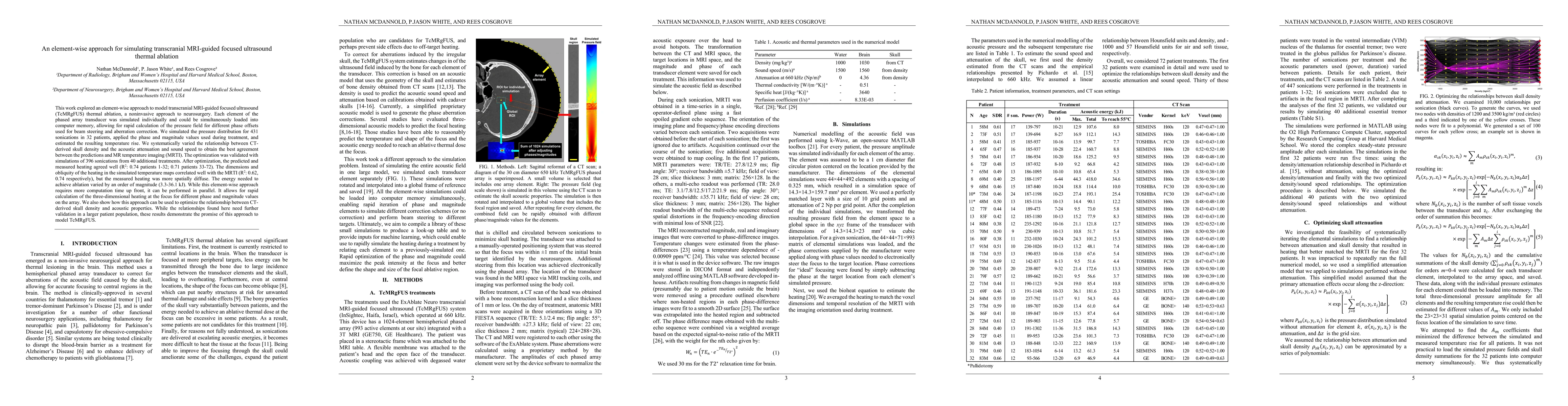 This paper presents an element-wise simulation method for modeling transcranial MRI-guided focused ultrasound thermal ablation, achieving rapid pressure field calculations and optimizing the relationship between skull density and acoustic properties. The approach shows promising results in predicting heating patterns, though further validation is needed.