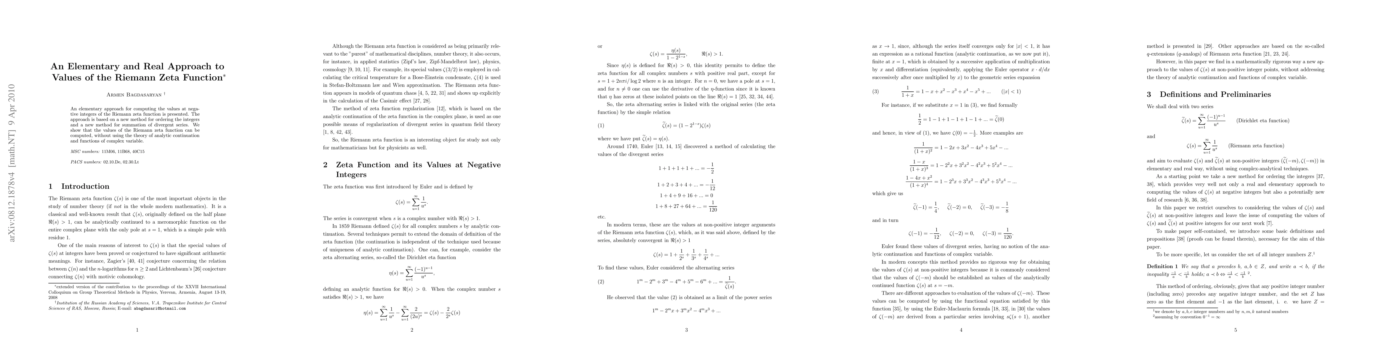An elementary approach for computing the values at negative integers of the Riemann zeta function is presented. The approach is based on a new method for ordering the integers and a new method for summation of divergent series. We show that the values of the Riemann zeta function can be computed, without using the theory of analytic continuation and functions of complex variable.