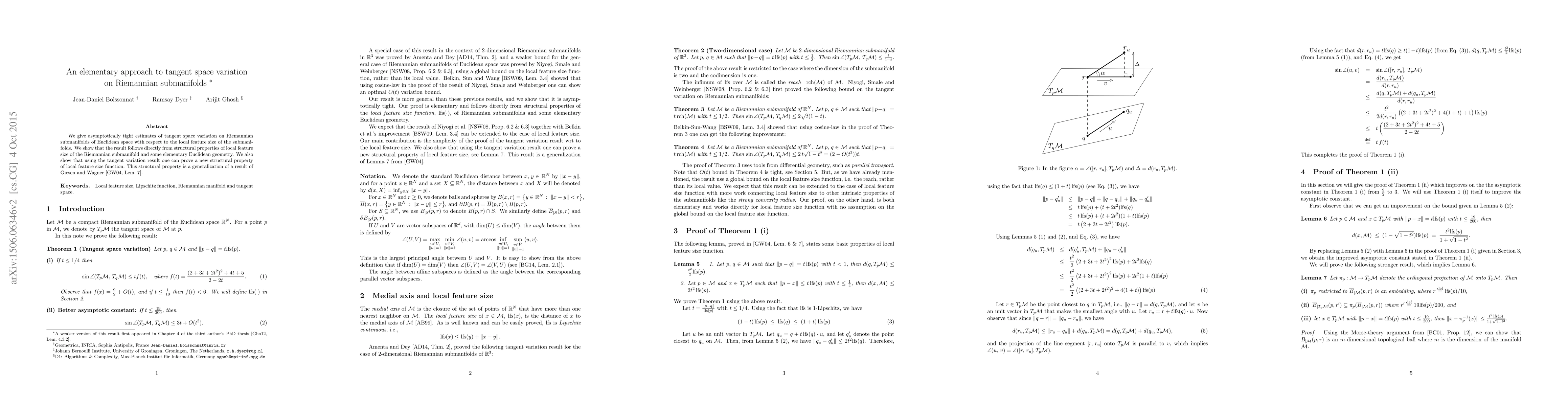 We give asymptotically tight estimates of tangent space variation on Riemannian submanifolds of Euclidean space with respect to the local feature size of the submanifolds. We show that the result follows directly from structural properties of local feature size of the Riemannian submanifold and some elementary Euclidean geometry. We also show that using the tangent variation result one can prove a new structural property of local feature size function. This structural property is a generalization of a result of Giesen and Wagner [GW04, Lem. 7].