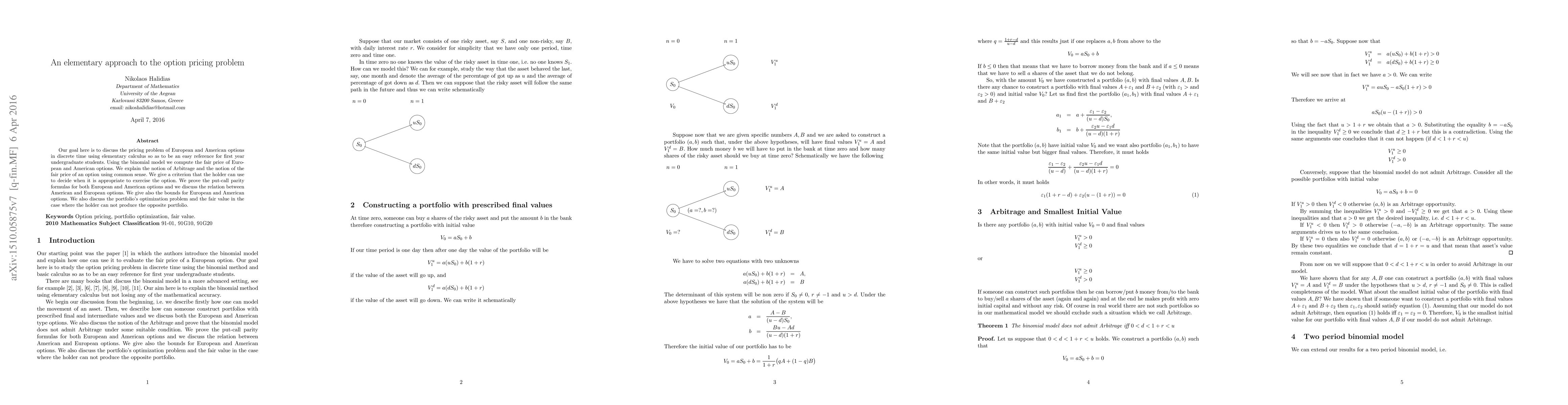 Our goal here is to discuss the pricing problem of European and American options in discrete time using elementary calculus so as to be an easy reference for first year undergraduate students. Using the binomial model we compute the fair price of European and American options. We explain the notion of Arbitrage and the notion of the fair price of an option using common sense. We give a criterion that the holder can use to decide when it is appropriate to exercise the option. We prove the put-call parity formulas for both European and American options and we discuss the relation between American and European options. We give also the bounds for European and American options. We also discuss the portfolio's optimization problem and the fair value in the case where the holder can not produce the opposite portfolio.