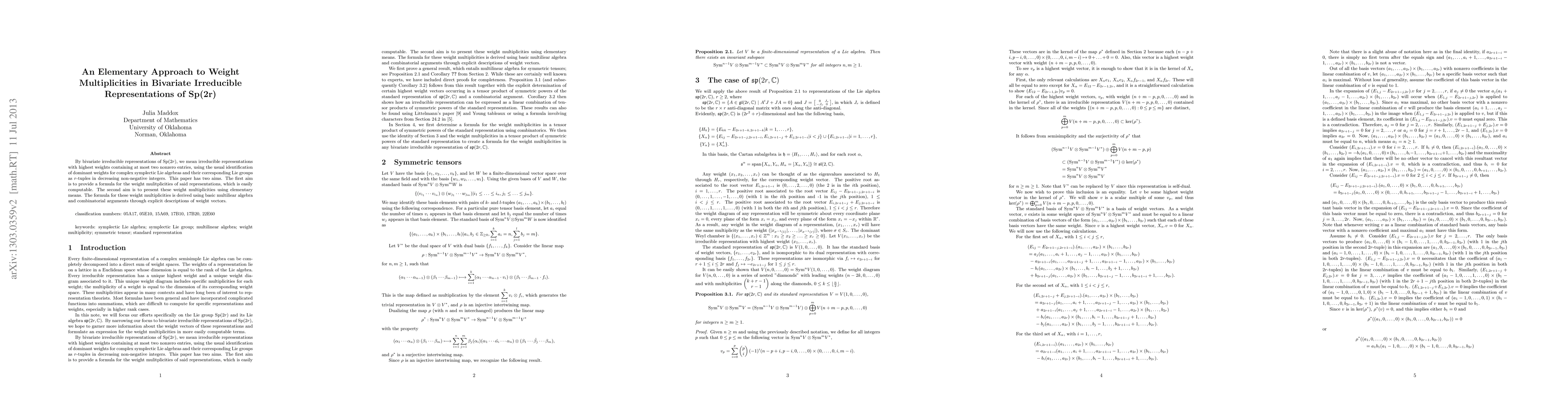 This paper derives a formula for the weight multiplicities in bivariate irreducible representations of ${\rm Sp}(2r)$, employing basic multivariate algebra and combinatorial methods. It aims to present these multiplicities in an easily computable and elementary manner.