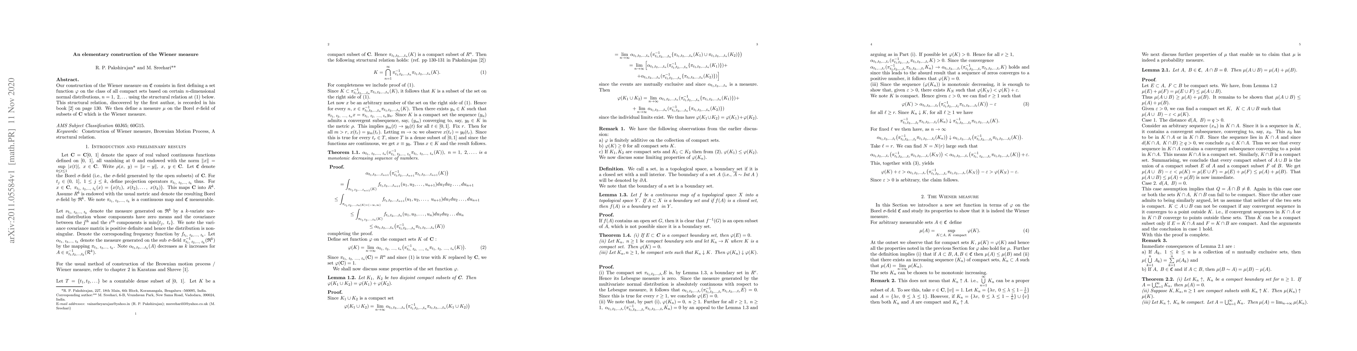 Researchers developed a new method to construct the Wiener measure, a fundamental concept in probability theory, using compact sets and n-dimensional normal distributions. This construction provides a clear understanding of the Wiener measure's underlying structure.