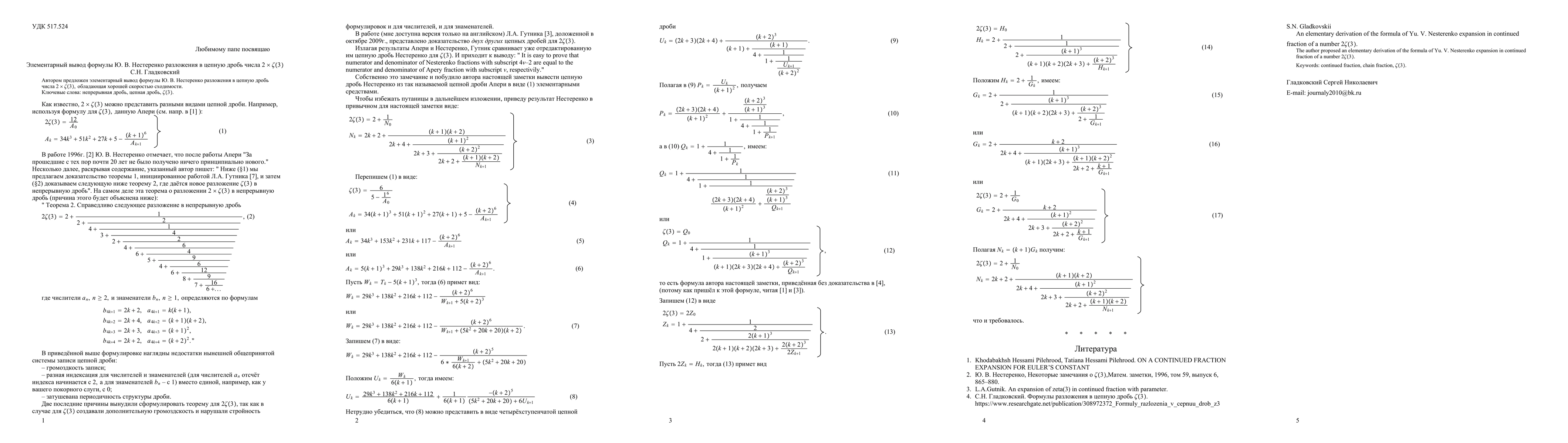 The author proposed an elementary derivation of the formula of Yu.V. Nesterenko expansion in continued fraction of a number 2*$\zeta(3)$.