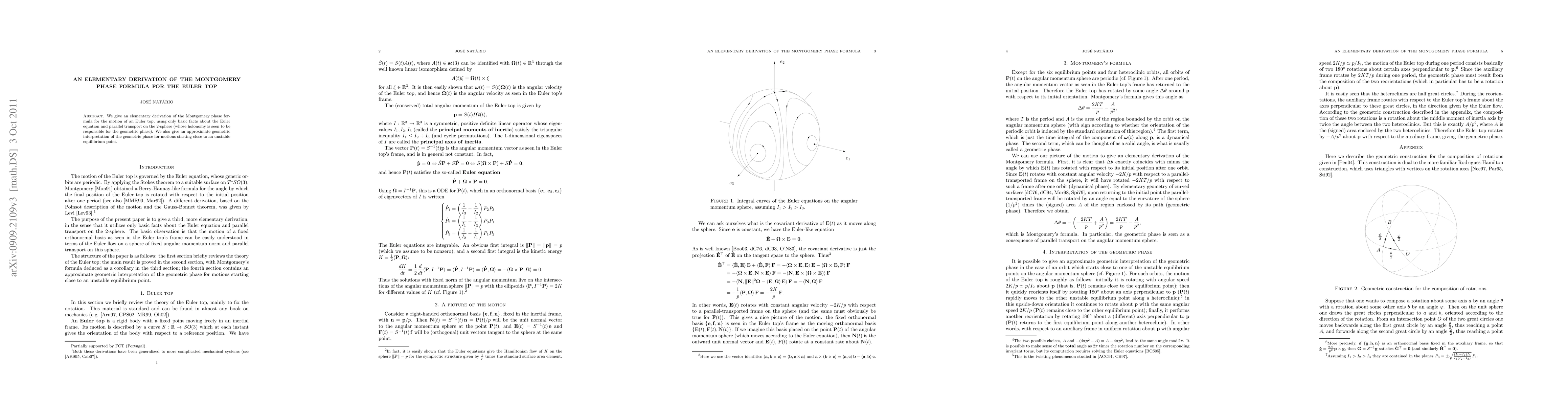 This paper presents an elementary derivation of the Montgomery phase formula for Euler top motion, utilizing basic Euler equation facts and 2-sphere parallel transport. It highlights sphere holonomy's role in geometric phase and offers an approximate interpretation for motions near unstable equilibrium points.
