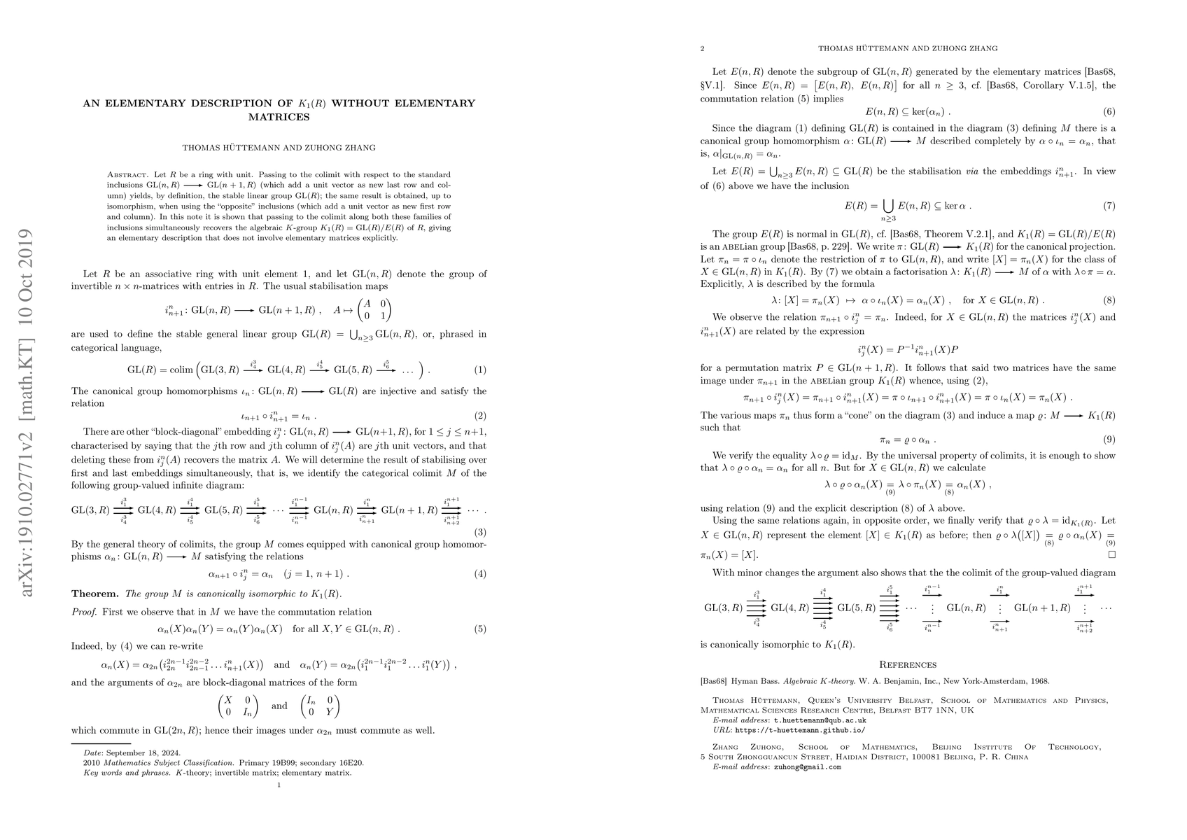 Let $R$ be a ring with unit. Passing to the colimit with respect to the standard inclusions $GL(n,R) \to GL(n+1,R)$ (which add a unit vector as new last row and column) yields, by definition, the stable linear group $GL(R)$; the same result is obtained, up to isomorphism, when using the "opposite" inclusions (which add a unit vector as new first row and column). In this note it is shown that passing to the colimit along both these families of inclusions simultaneously recovers the algebraic $K$-group $K_1(R) = GL(R)/E(R)$ of~$R$, giving an elementary description that does not involve elementary matrices explicitly.