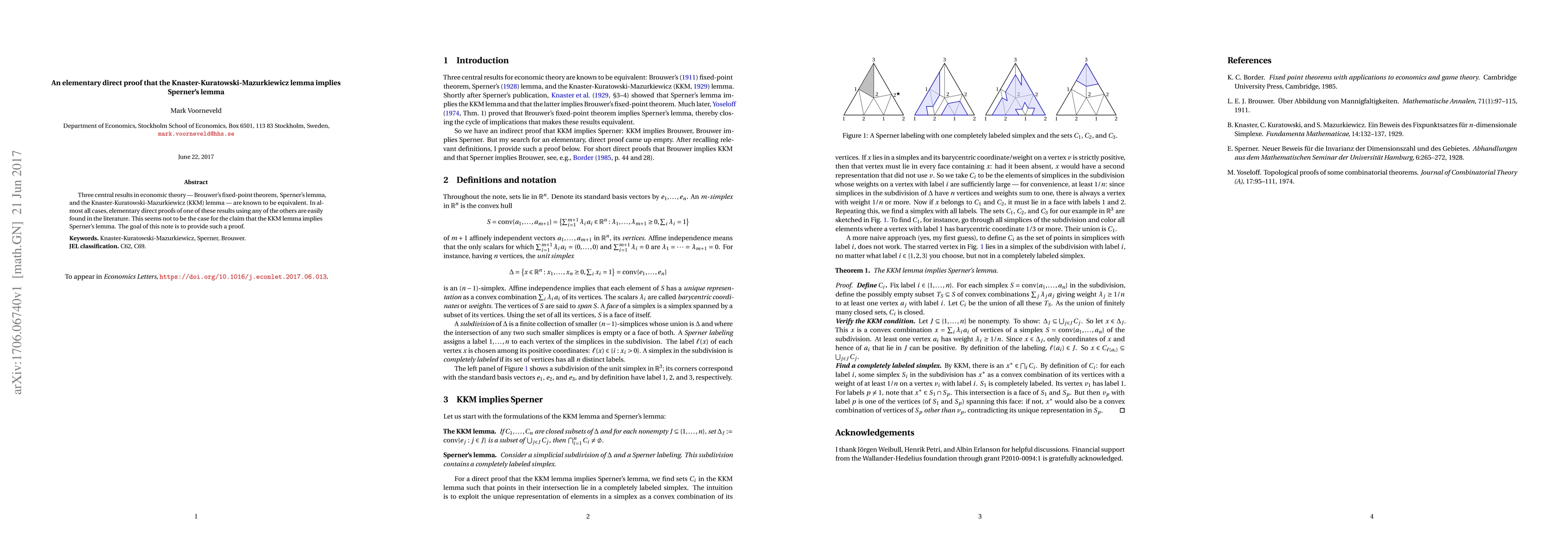 Three central results in economic theory --- Brouwer's fixed-point theorem, Sperner's lemma, and the Knaster-Kuratowski-Mazurkiewicz (KKM) lemma --- are known to be equivalent. In almost all cases, elementary direct proofs of one of these results using any of the others are easily found in the literature. This seems not to be the case for the claim that the KKM lemma implies Sperner's lemma. The goal of this note is to provide such a proof.