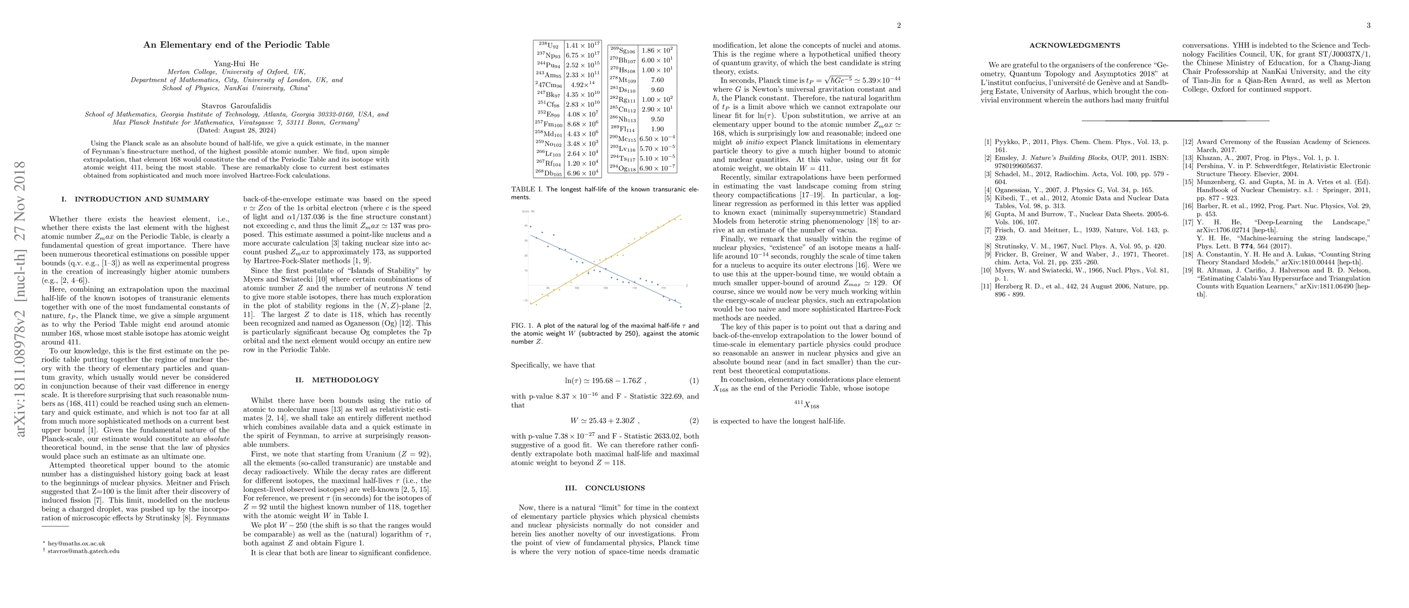Using the Planck scale as an absolute bound of half-life, we give a quick estimate, in the manner of Feynman's fine-structure method, of the highest possible atomic number. We find, upon simple extrapolation, that element 168 would constitute the end of the Periodic Table and its isotope with atomic weight 411, being the most stable. These are remarkably close to current best estimates obtained from sophisticated and much more involved Hartree-Fock calculations.