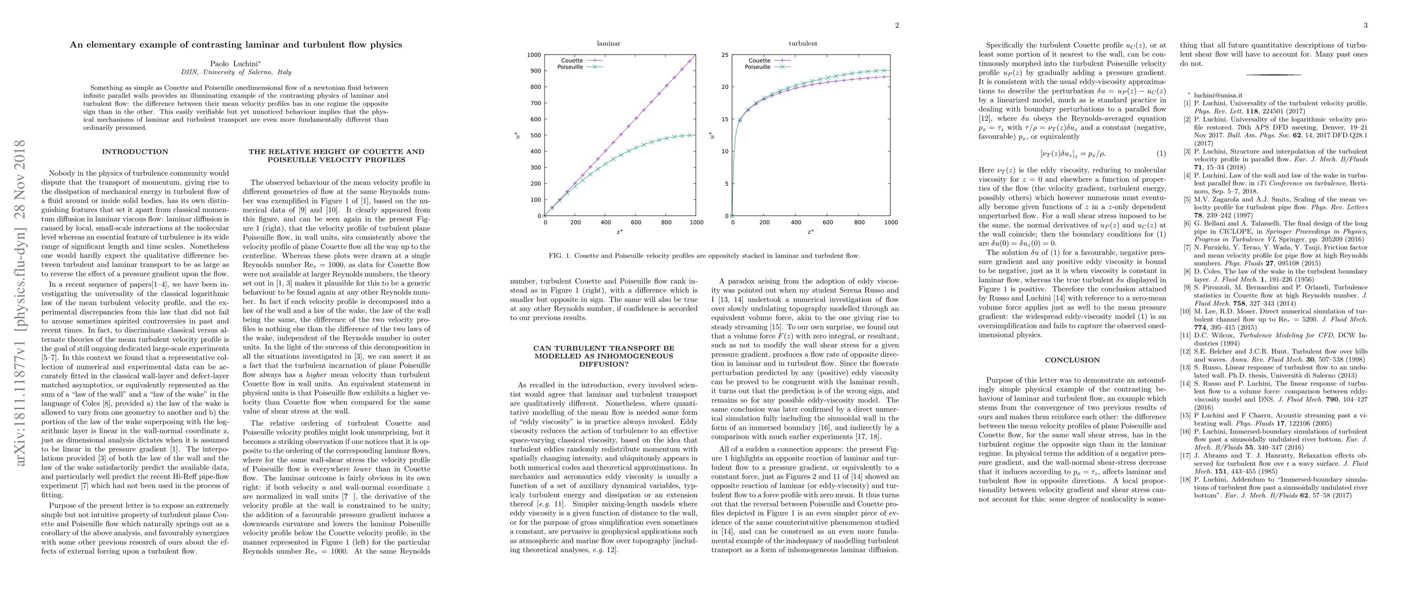 Something as simple as Couette and Poiseuille onedimensional flow of a newtonian fluid between infinite parallel walls provides an illuminating example of the contrasting physics of laminar and turbulent flow: the difference between their mean velocity profiles has in one regime the opposite sign than in the other. This easily verifiable but yet unnoticed behaviour implies that the physical mechanisms of laminar and turbulent transport are even more fundamentally different than ordinarily presumed.