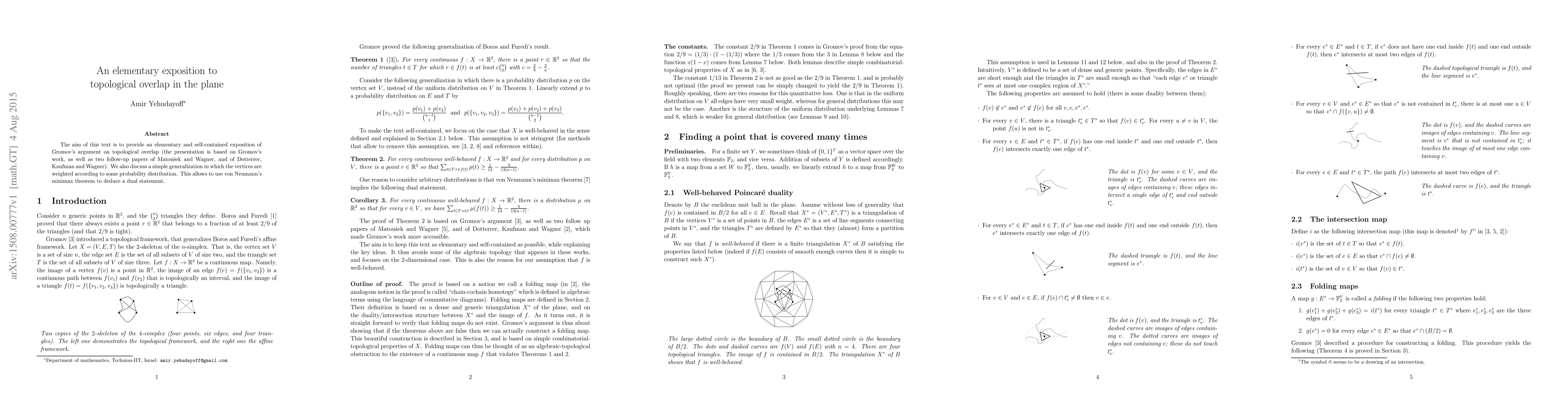 The aim of this text is to provide an elementary and self-contained exposition of Gromov's argument on topological overlap (the presentation is based on Gromov's work, as well as two follow-up papers of Matousek and Wagner, and of Dotterrer, Kaufman and Wagner). We also discuss a simple generalization in which the vertices are weighted according to some probability distribution. This allows to use von Neumann's minimax theorem to deduce a dual statement.