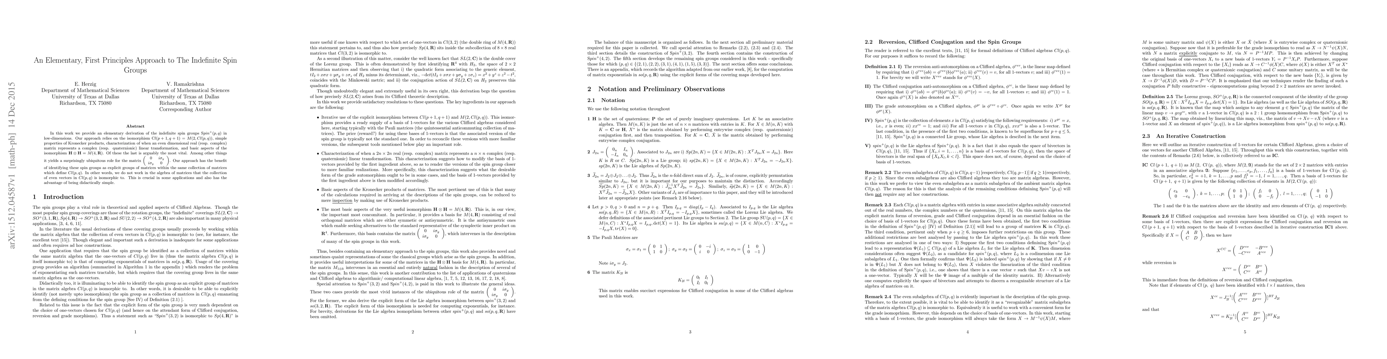 In this work we provide an elementary derivation of the indefinite spin groups in low-dimensions. Our approach relies on the isomorphism of Cl(p+1, q+1) to the algebra 2x2 matrices with entries in Cl(p,q), simple properties of Kronecker products, characterization of when an even dimensional real (resp. complex) matrix represents a complex (resp. quaternionic) linear transformation, and basic aspects of the isomorphism between M(4, R) and the quaternion tensor product. Of these the last is arguably the most vital. Among other things it yields naturally, a surprisingly ubiquitous role for an alternative to the standard representation of the symplectic form in dimension four. Our approach has the benefit of identifying these spin groups as explicit groups of matrices within the same collection of matrices which define $Cl(p, q)$. In other words, we do not work in the algebra of matrices that the collection of even vectors in $Cl(p,q)$ is isomorphic to. This is crucial in some applications and also has the advantage of being didactically simple.