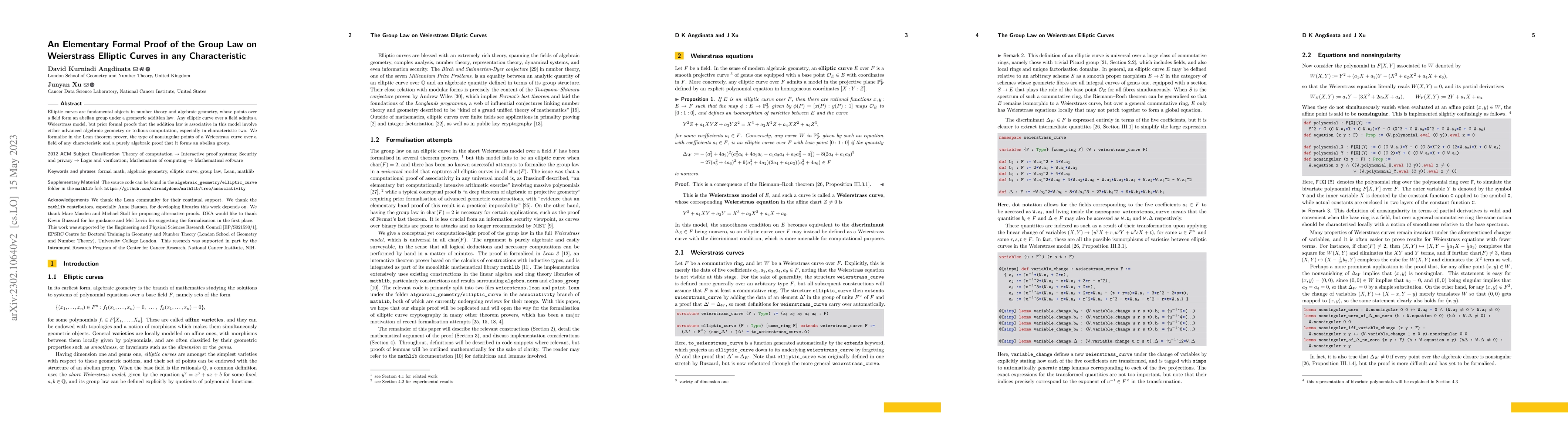 Elliptic curves are fundamental objects in number theory and algebraic geometry, whose points over a field form an abelian group under a geometric addition law. Any elliptic curve over a field admits a Weierstrass model, but prior formal proofs that the addition law is associative in this model involve either advanced algebraic geometry or tedious computation, especially in characteristic two. We formalise in the Lean theorem prover, the type of nonsingular points of a Weierstrass curve over a field of any characteristic and a purely algebraic proof that it forms an abelian group.