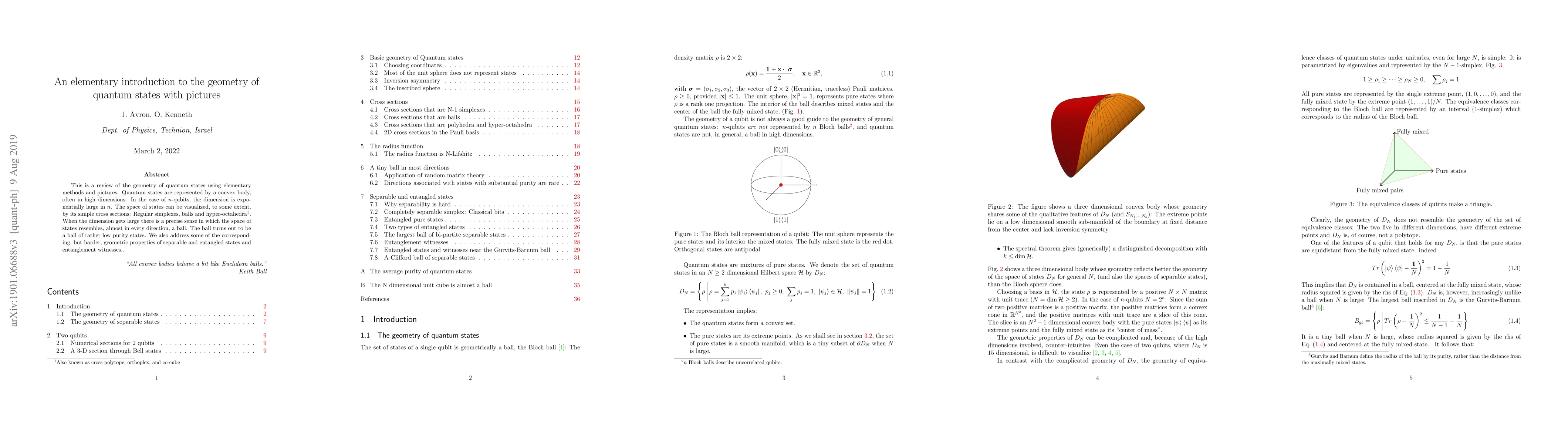 This is a review of the geometry of quantum states using elementary methods and pictures. Quantum states are represented by a convex body, often in high dimensions. In the case of n-qubits, the dimension is exponentially large in n. The space of states can be visualized, to some extent, by its simple cross sections: Regular simplexes, balls and hyper-octahedra. When the dimension gets large there is a precise sense in which the space of states resembles, almost in every direction, a ball. The ball turns out to be a ball of rather low purity states. We also address some of the corresponding, but harder, geometric properties of separable and entangled states and entanglement witnesses.